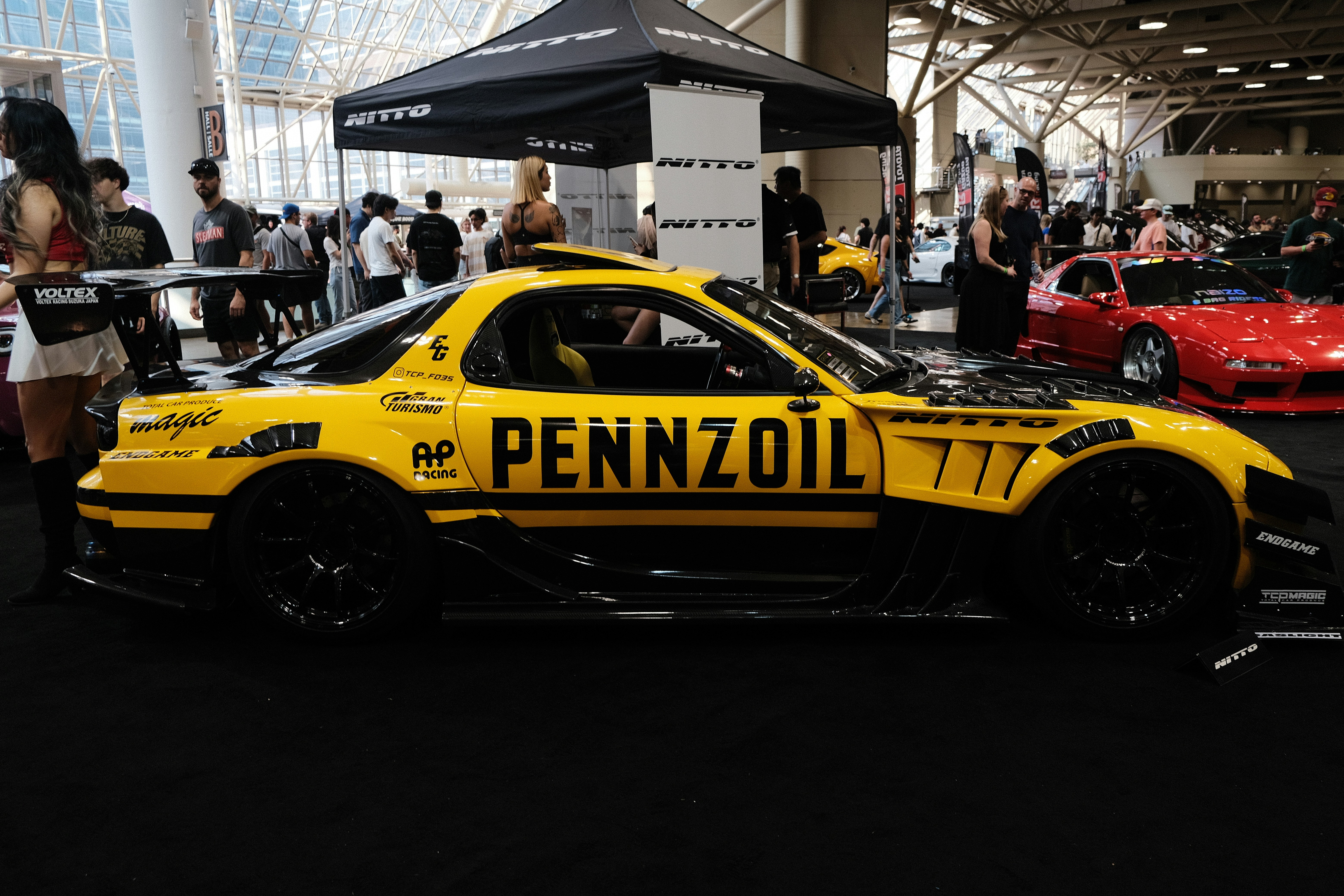 A yellow sports car parked in front of a crowd of people