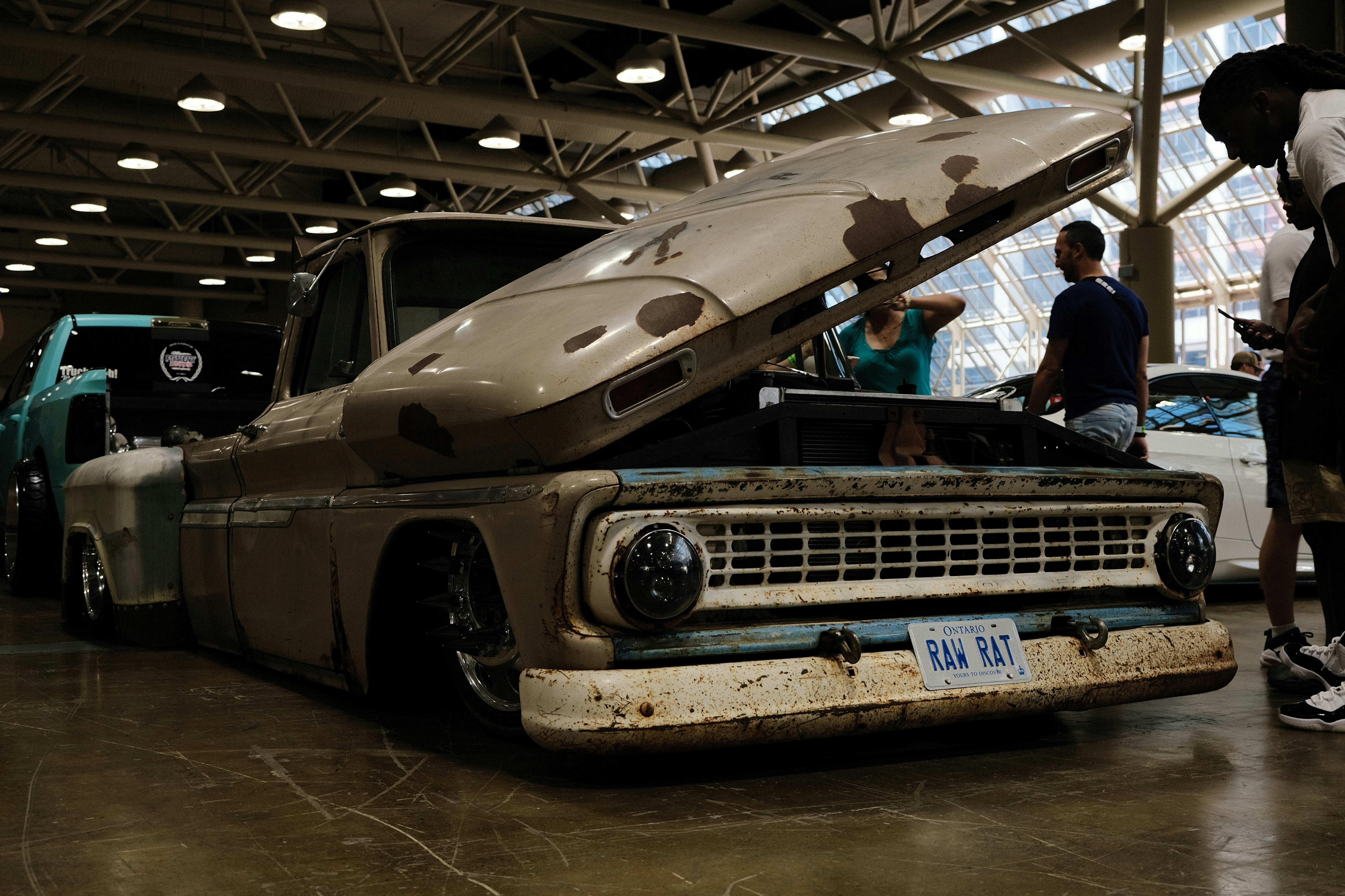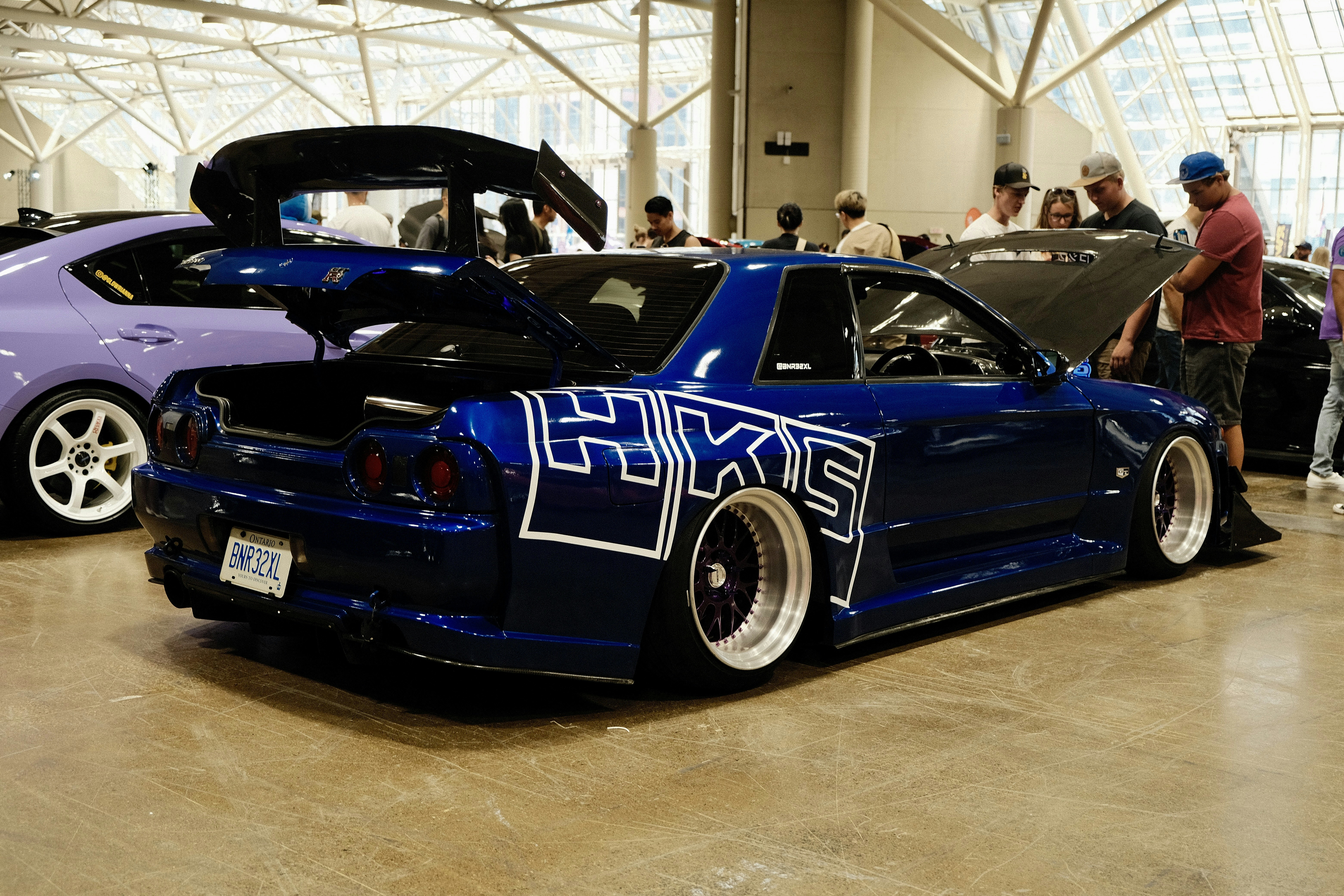 A group of people standing around a car in a garage