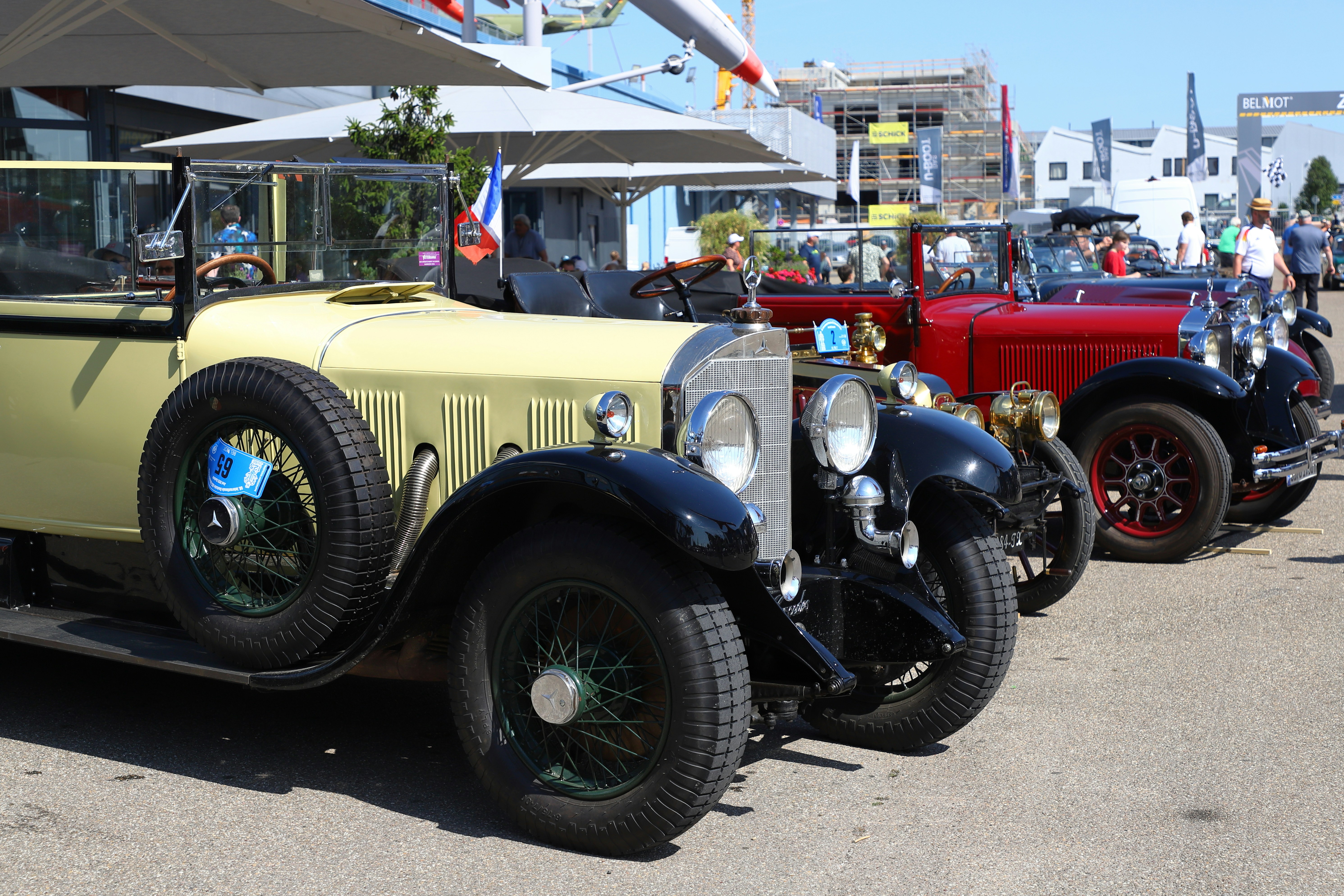 Row of vintage cars parked outdoors on a sunny day.