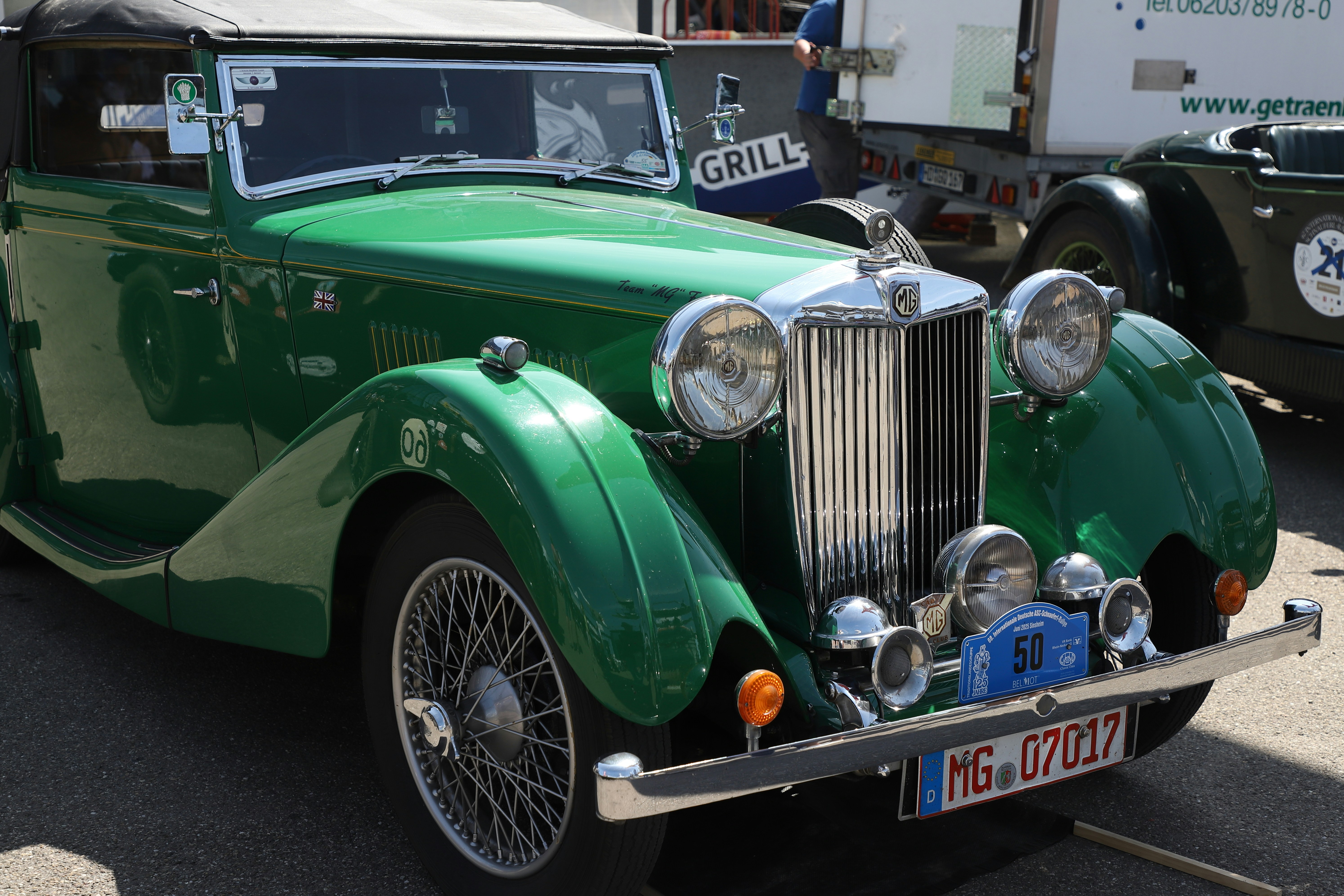 A vintage green mg convertible car