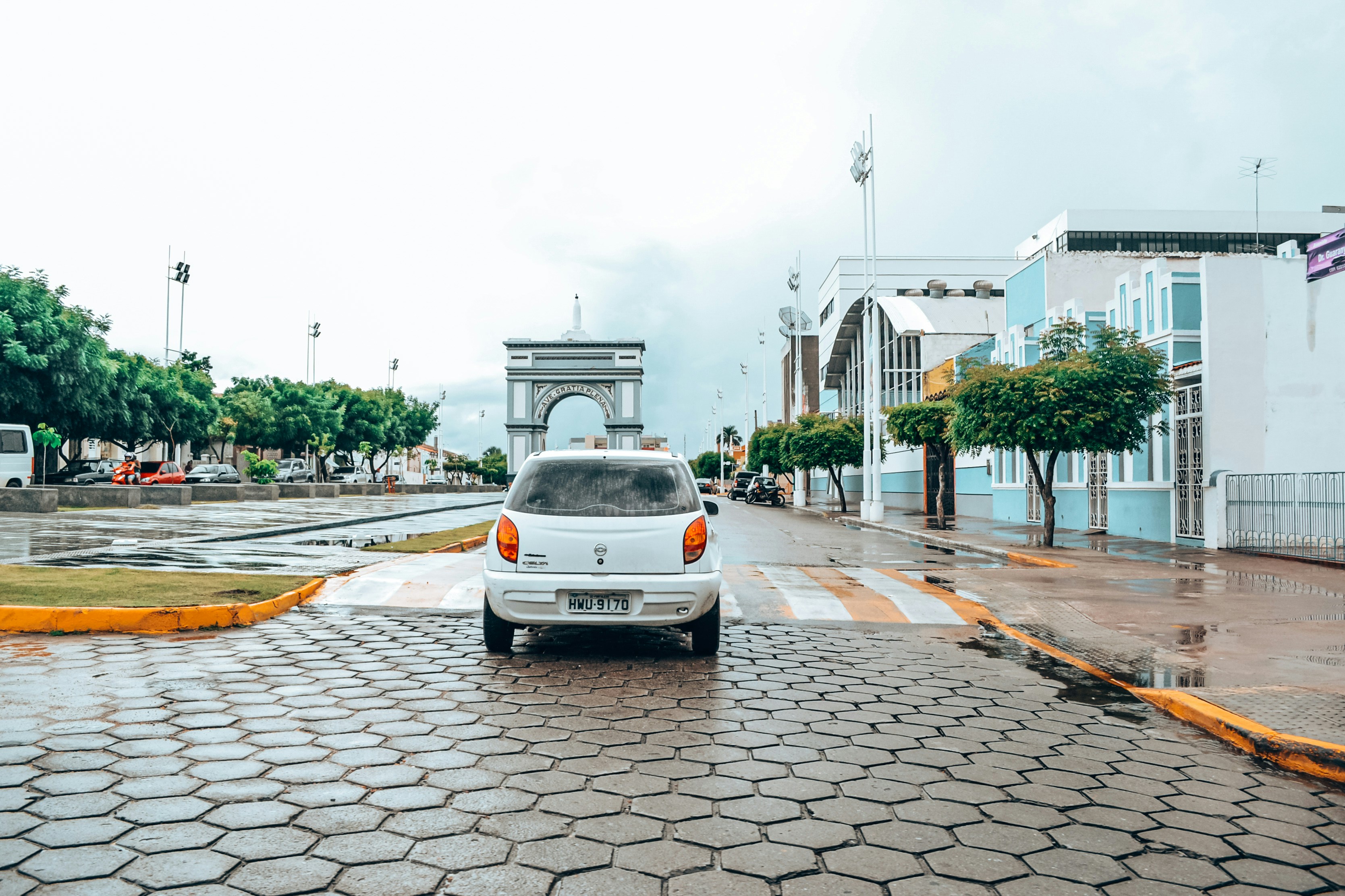 a white car driving down a wet street