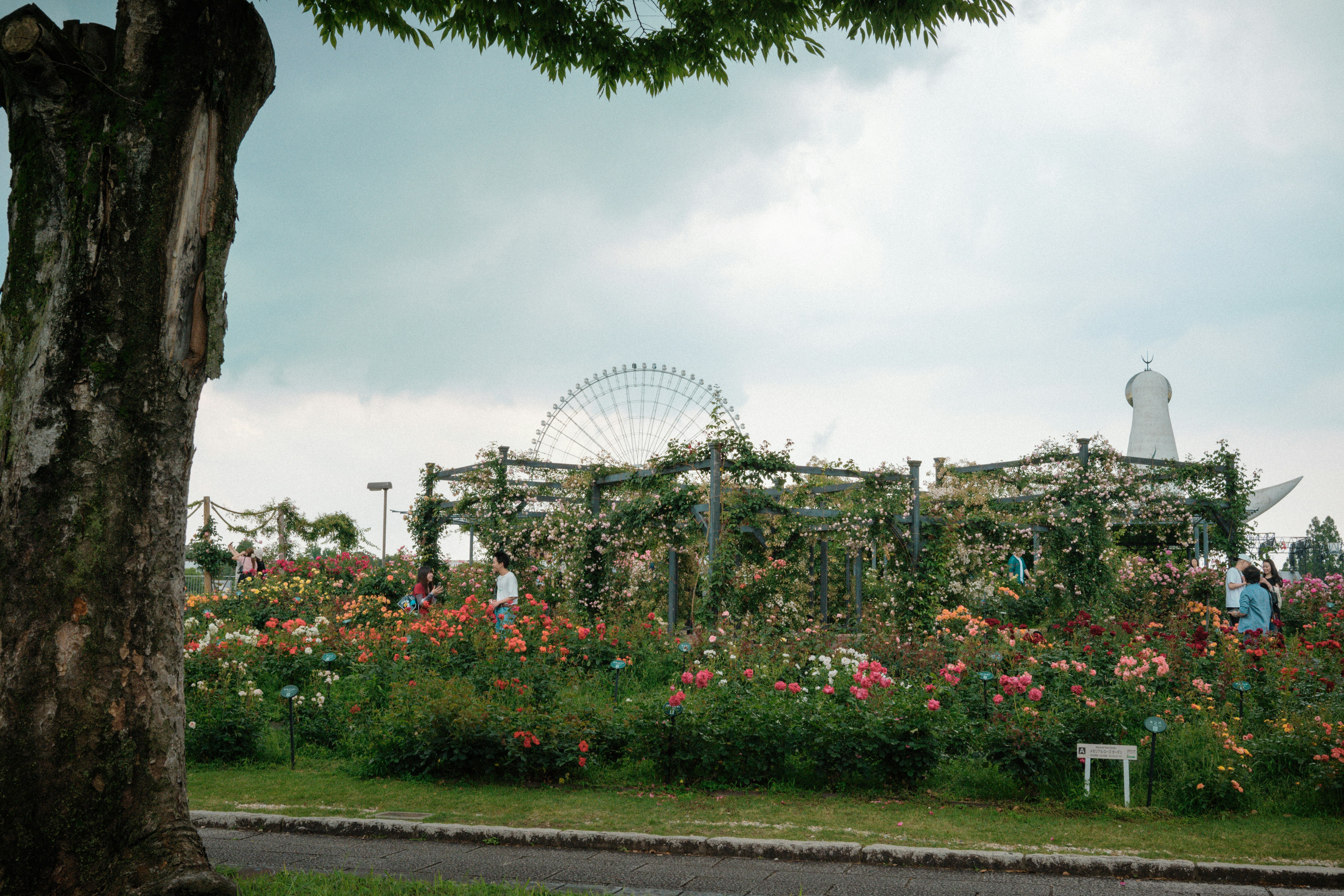 a park with flowers and a ferris wheel in the background