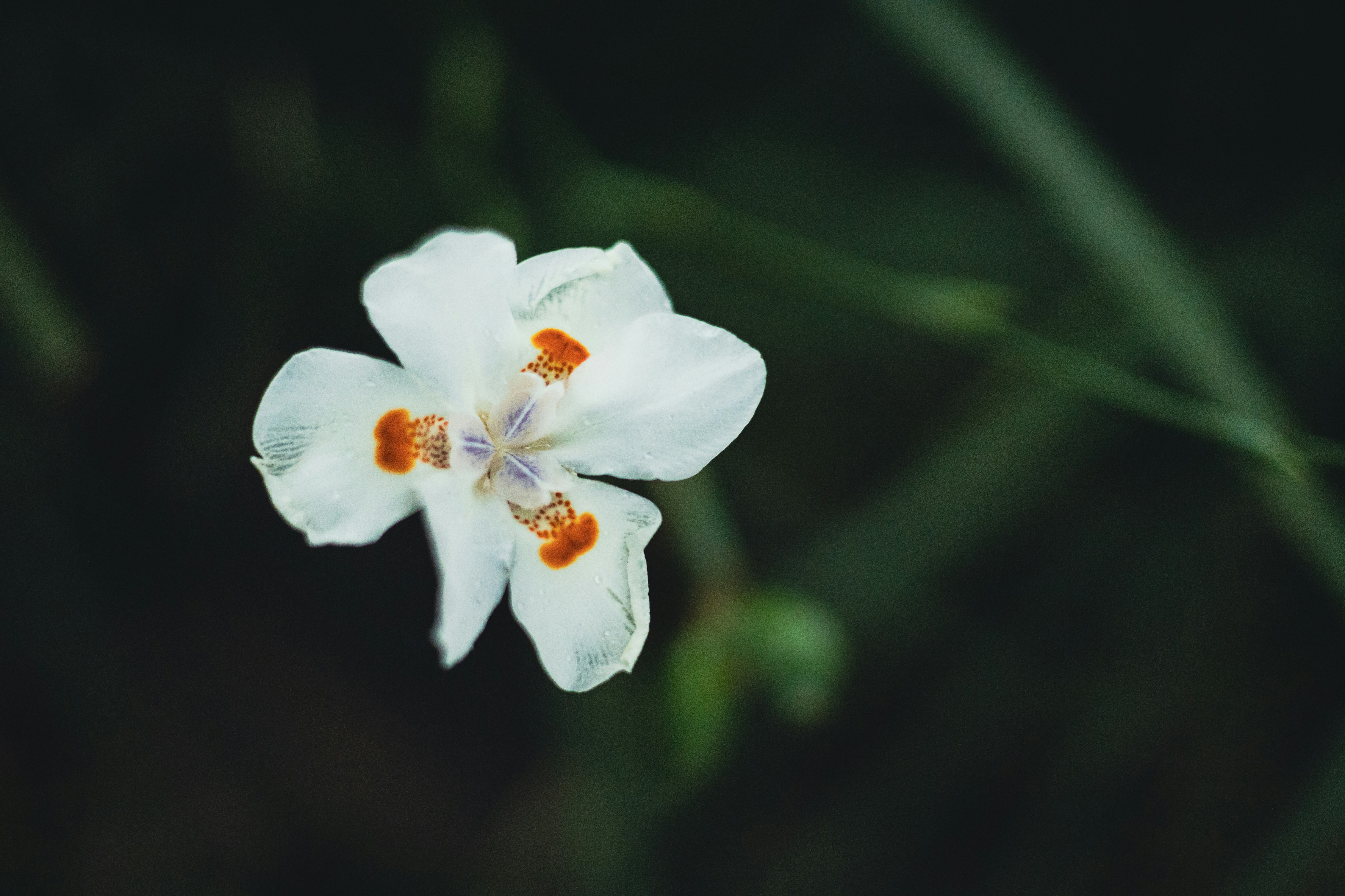 a close up of a white flower with orange stamen