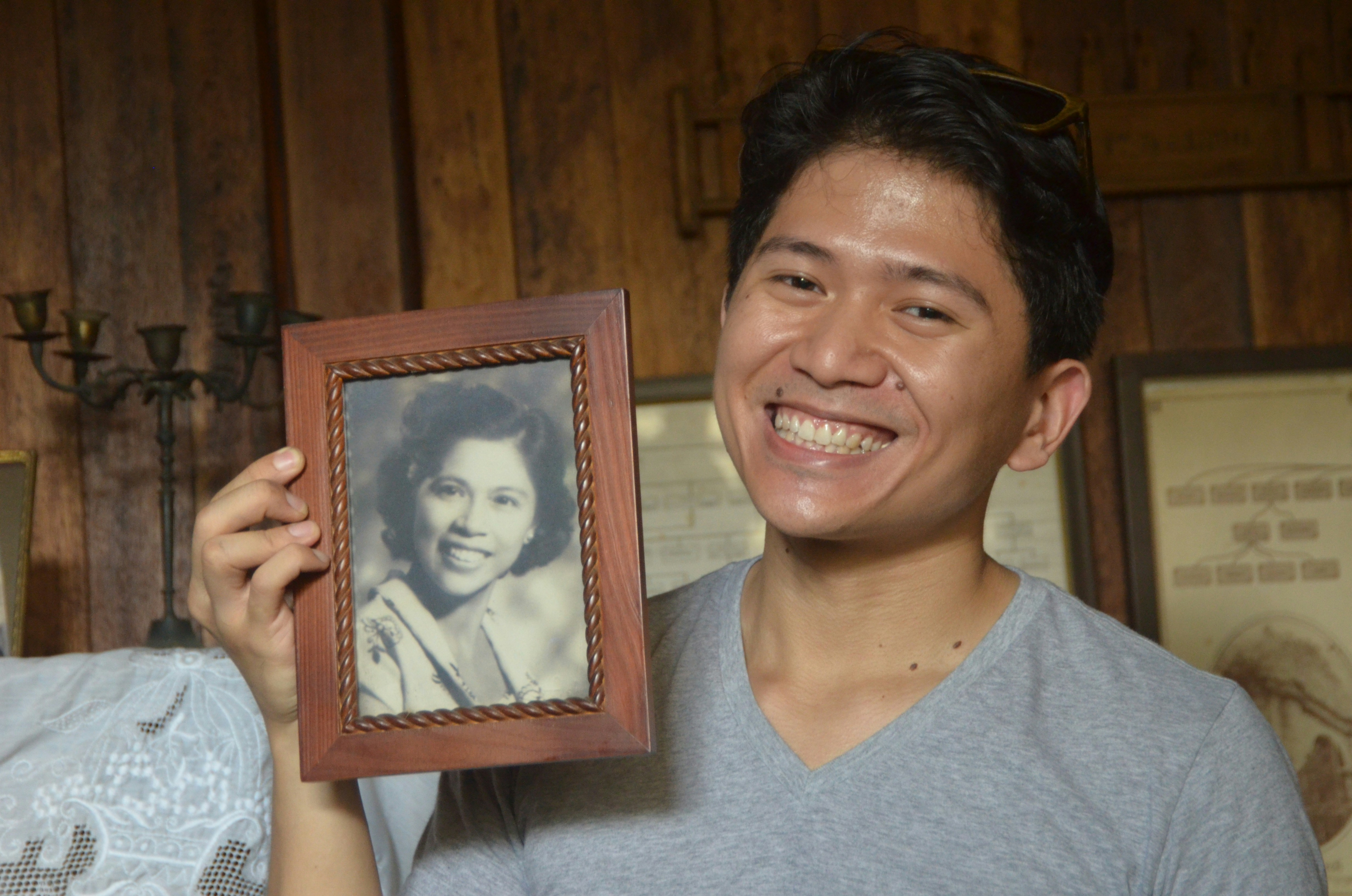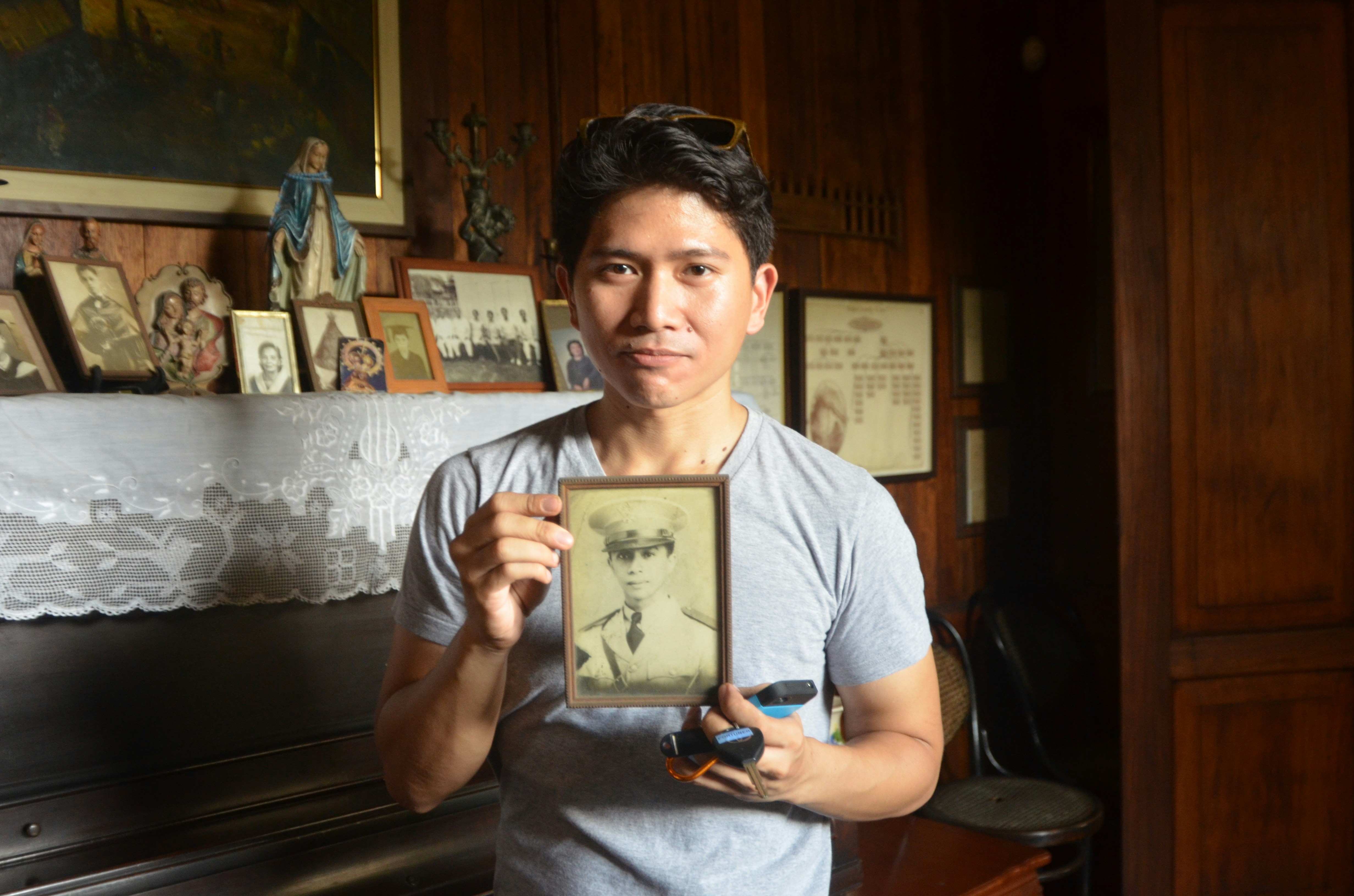 Young Filipino poses with photograph of his grandparent in his ancestral home.
