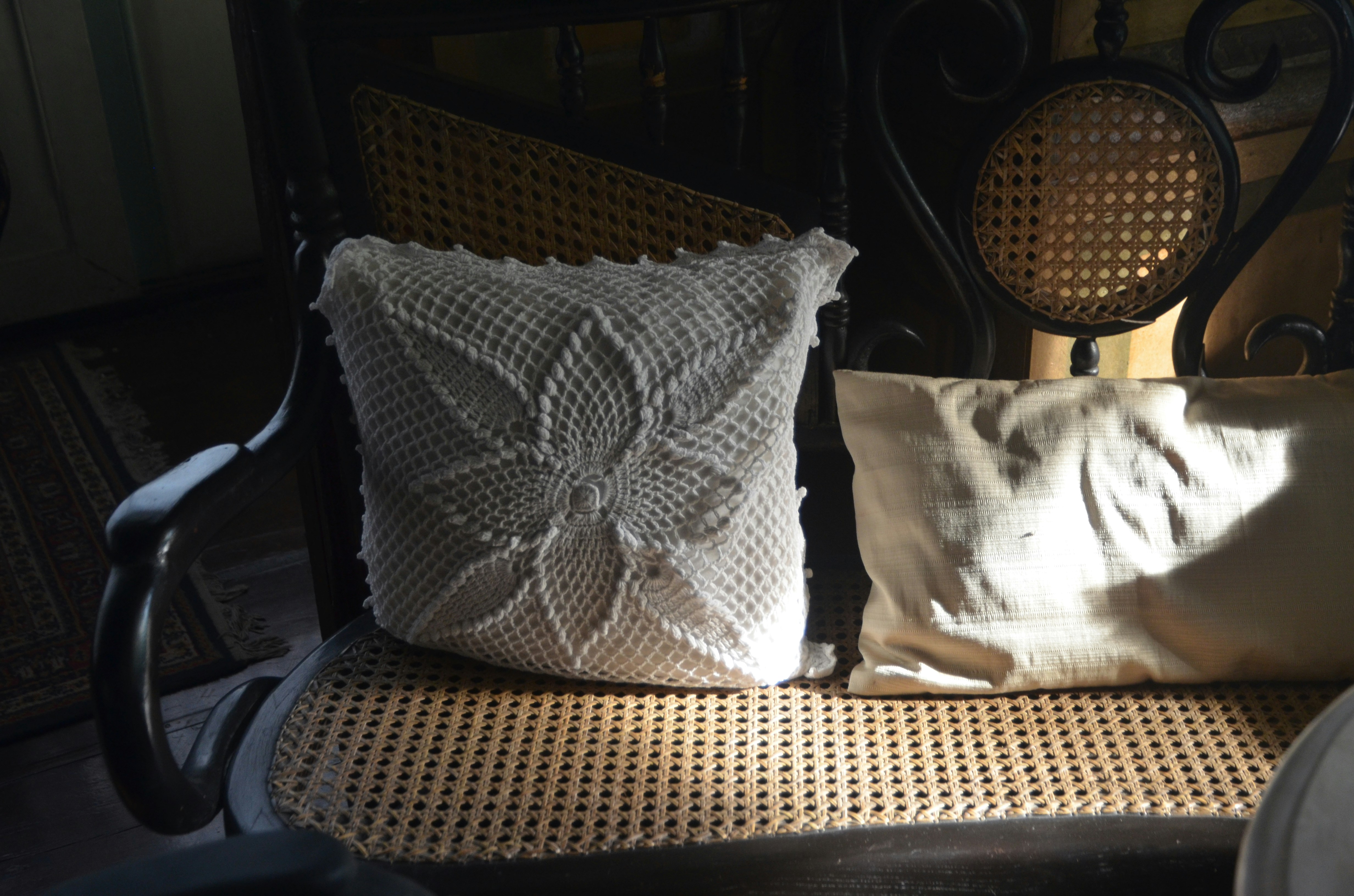 An old wooden couch upholstered with woven rattan, decorated with hand made crocheted pillows in the morning light