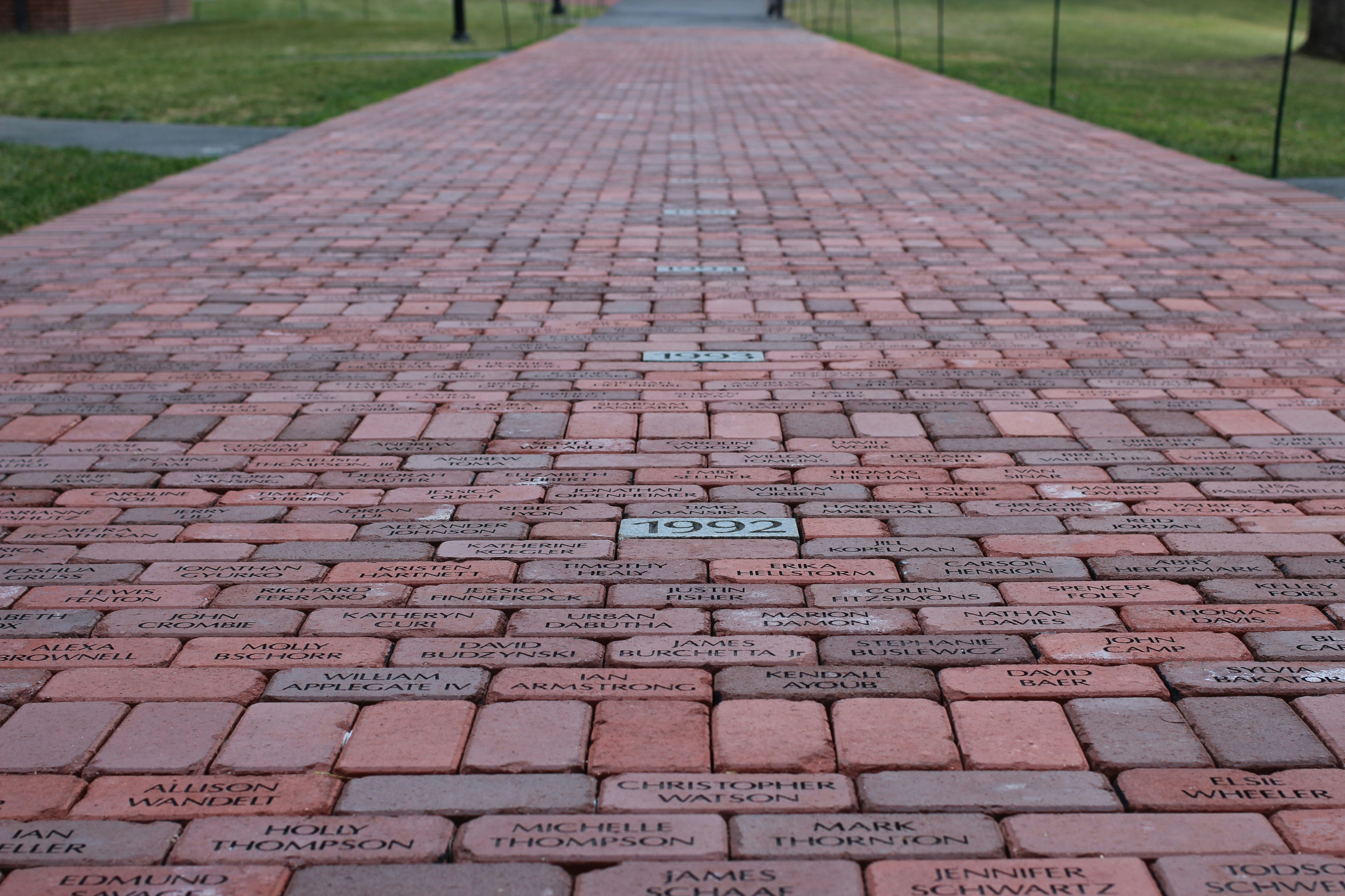 a brick walkway with names written on it