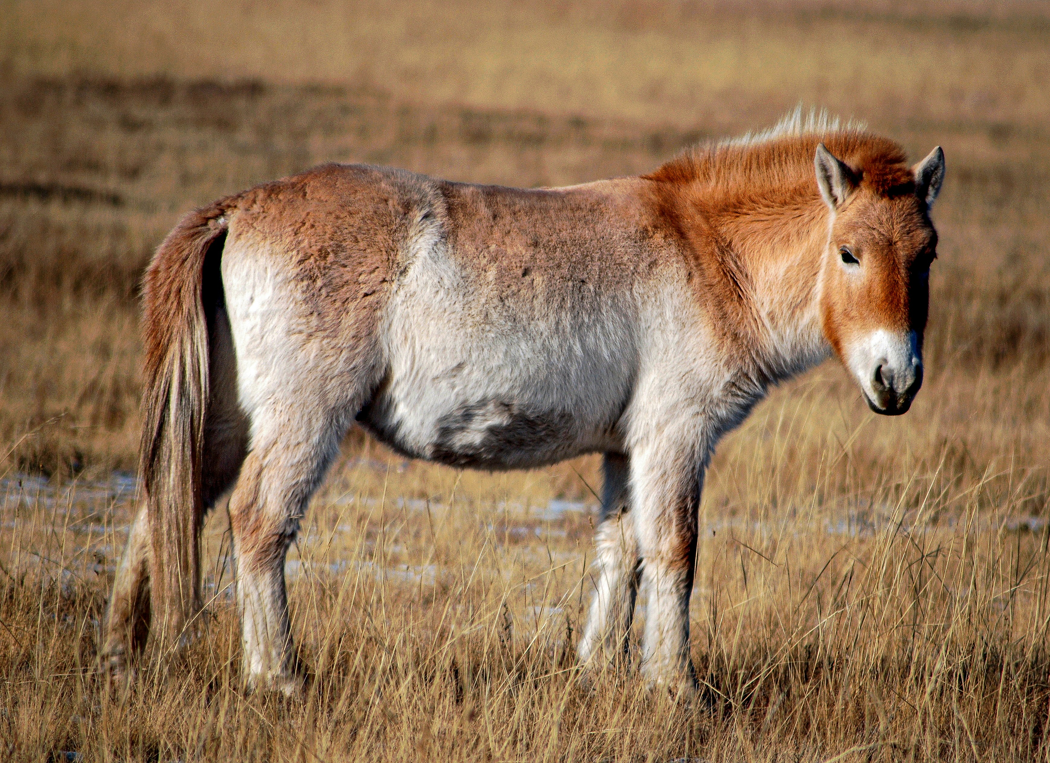 Young takhi (Przewalski horse), looking at the camera, fully wild horse.