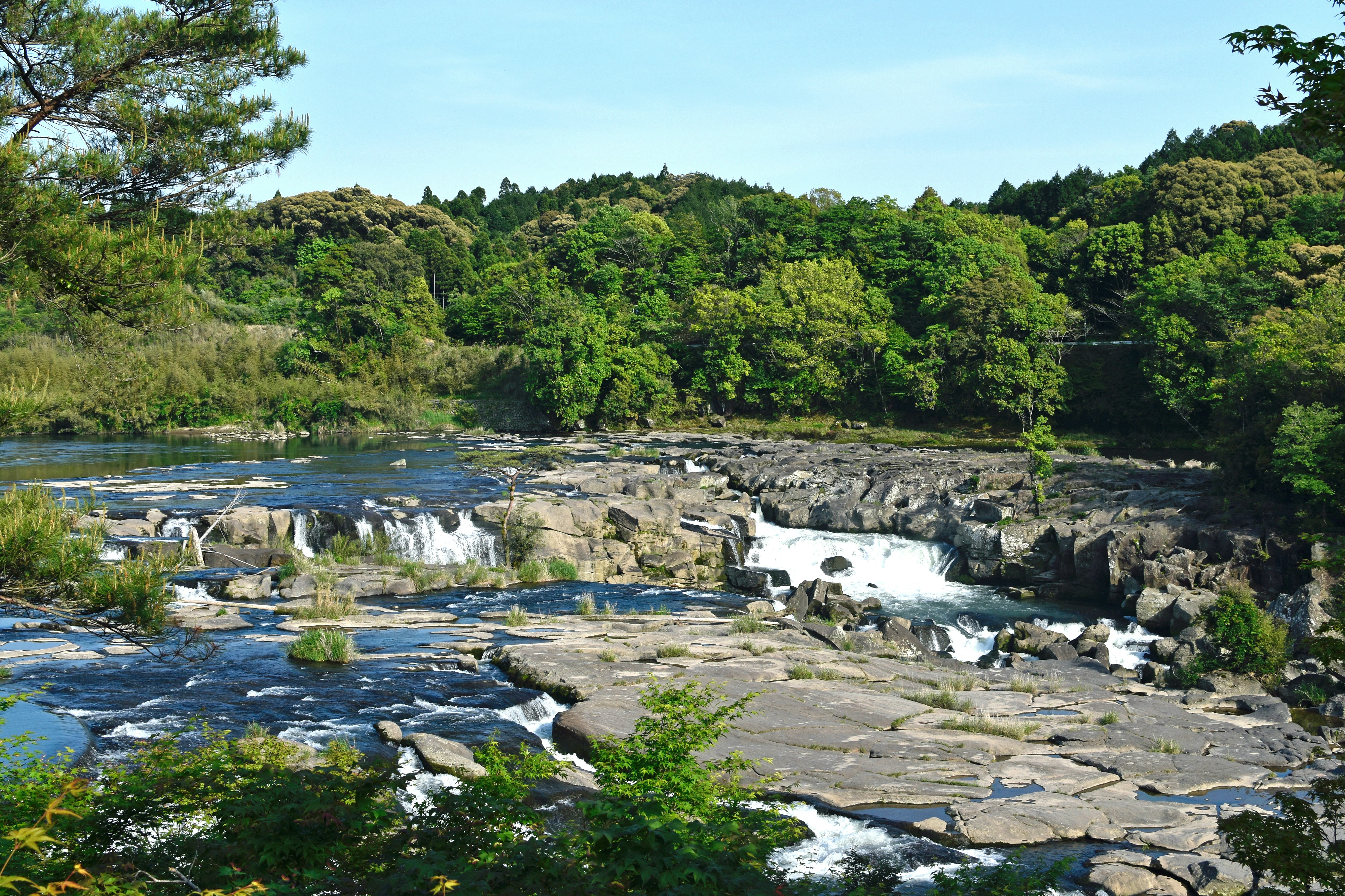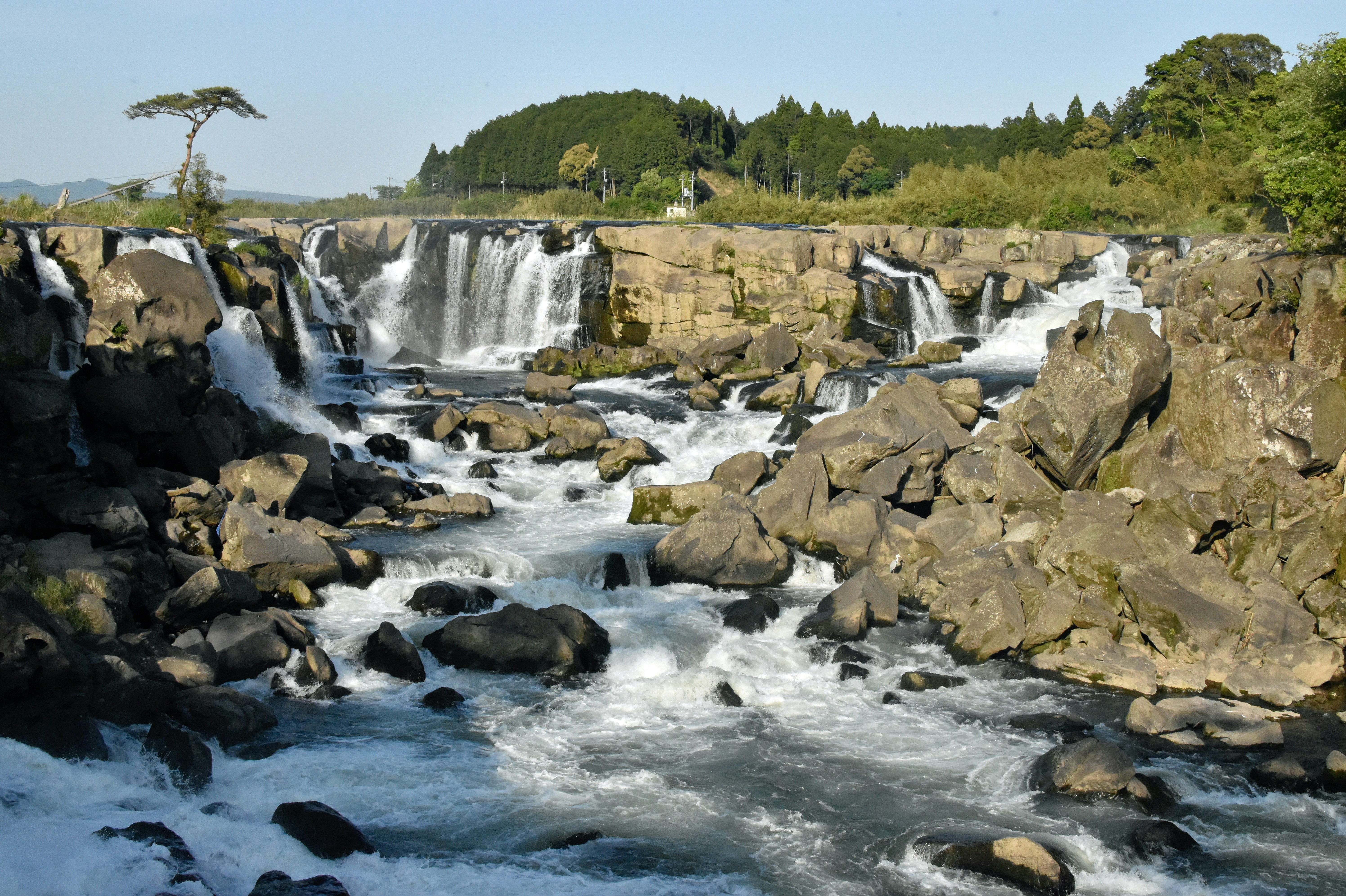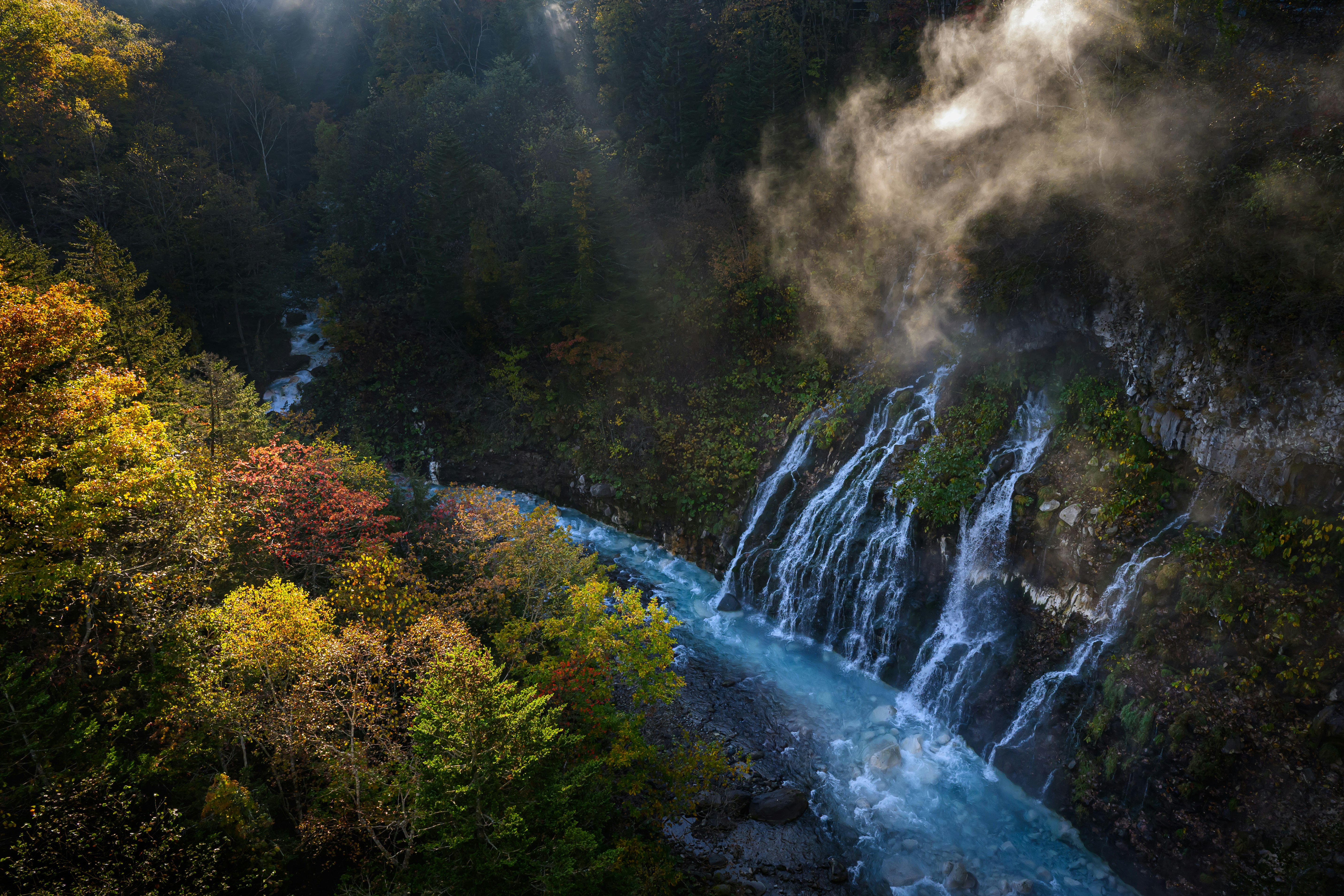 Shirahige-no-Take falls - one of the rare waterfalls in Japan where the subterranean water flows down out of the cracks in the rock wall with great force! The Biei River or Blue River flows underneath.