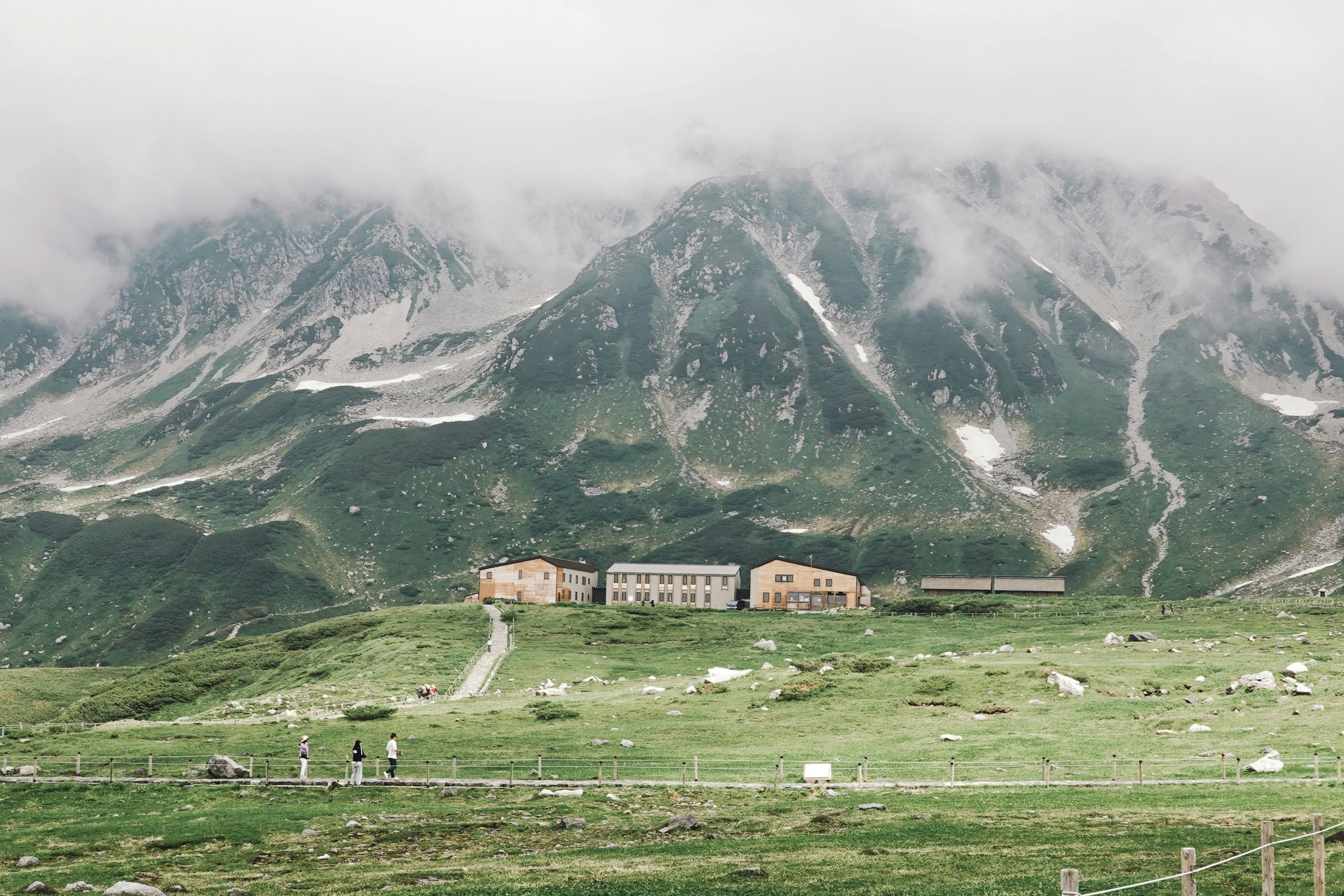 After a rainfall, Ogizawa in Tateyama Kurobe transforms into a mystical landscape, with mist lingering over the mountain peaks that encircle the area. The freshly dampened earth enhances the deep greens of the forests, while the clouds cling to the slopes, creating an ethereal atmosphere. The rain-soaked mountains stand majestically, shrouded in soft fog, offering a serene and almost otherworldly beauty, capturing the tranquil essence of nature after the rain.