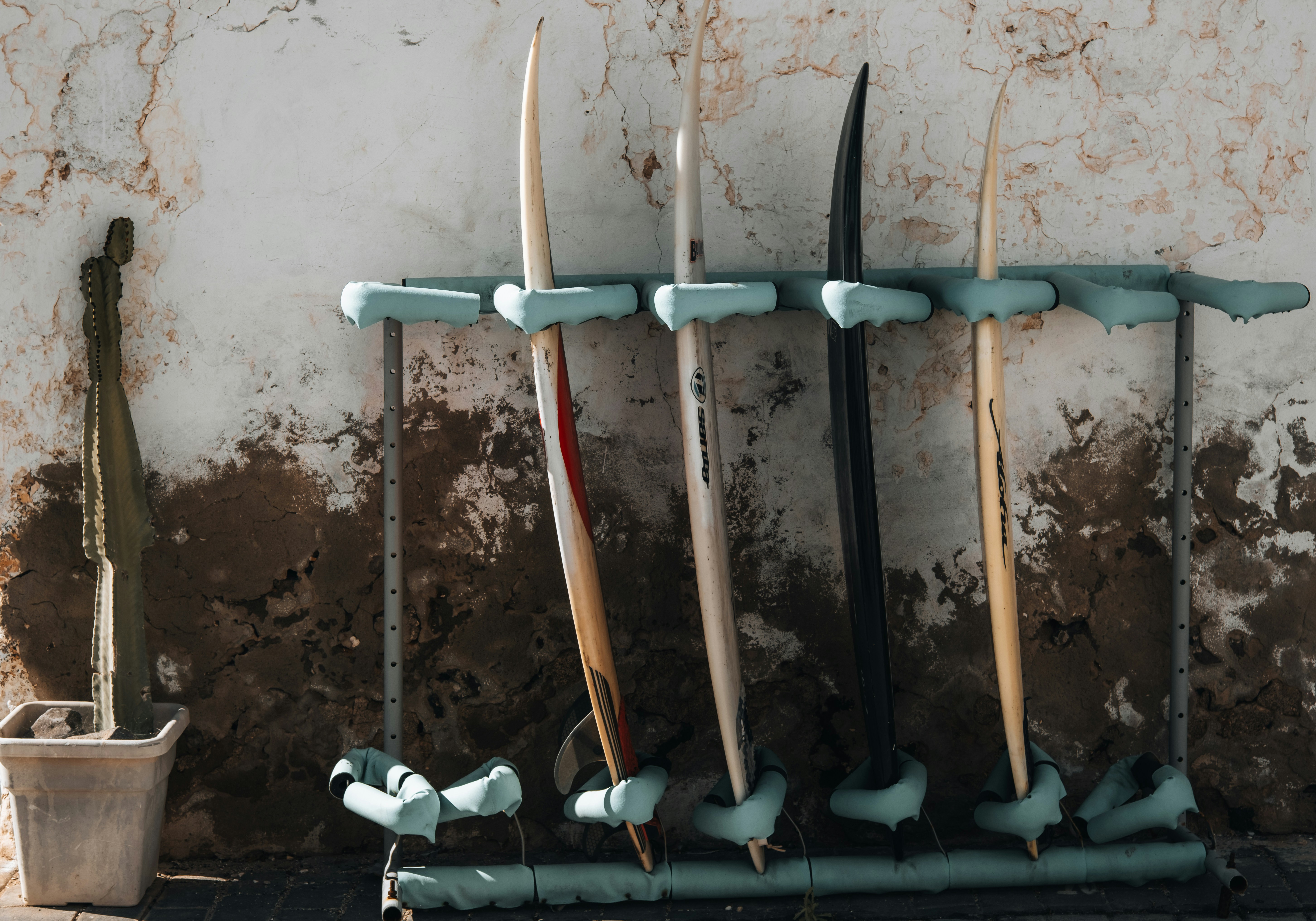 A bunch of surfboards are hanging on a wall