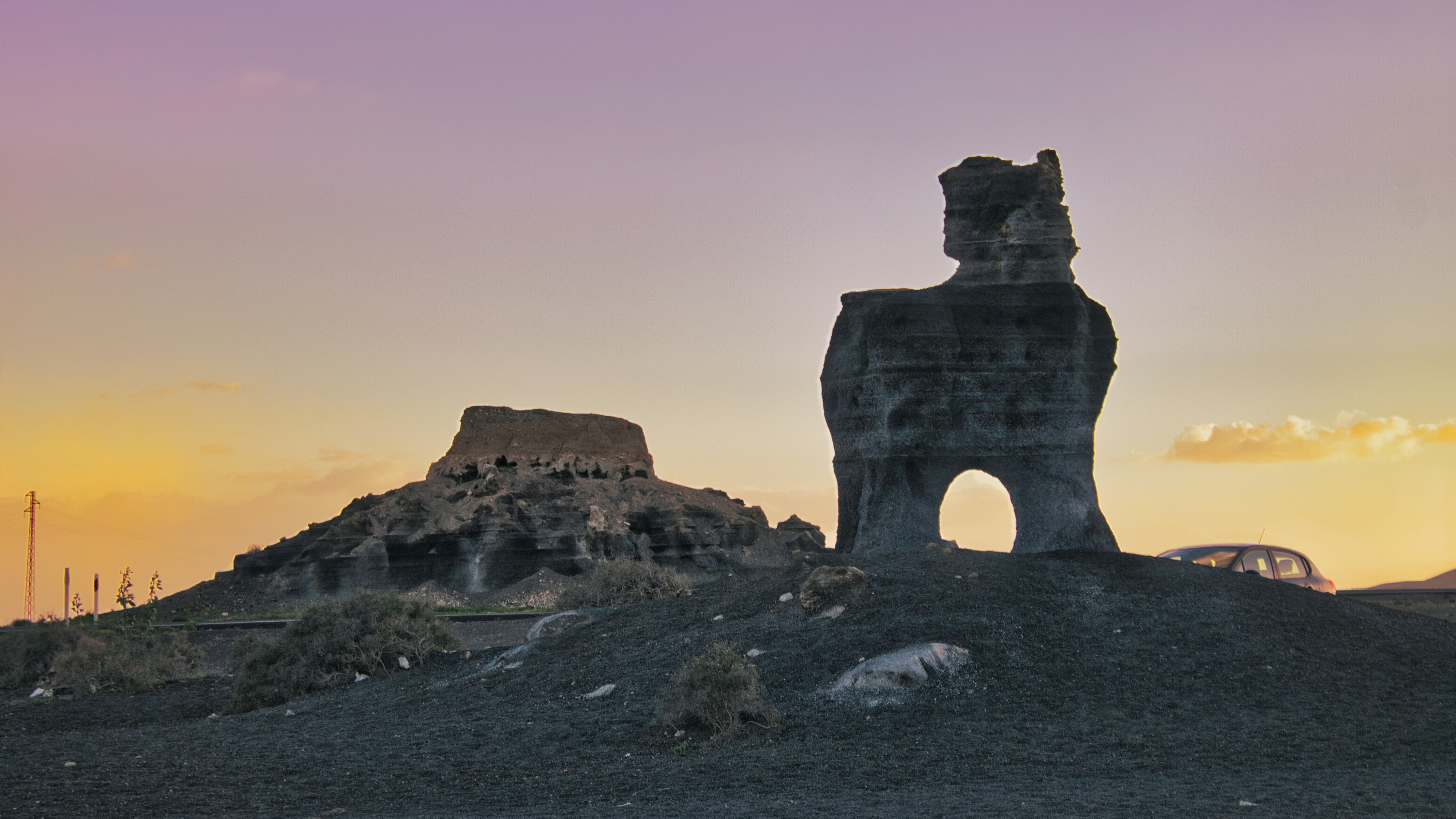 A rock formation sits under a colorful sky.