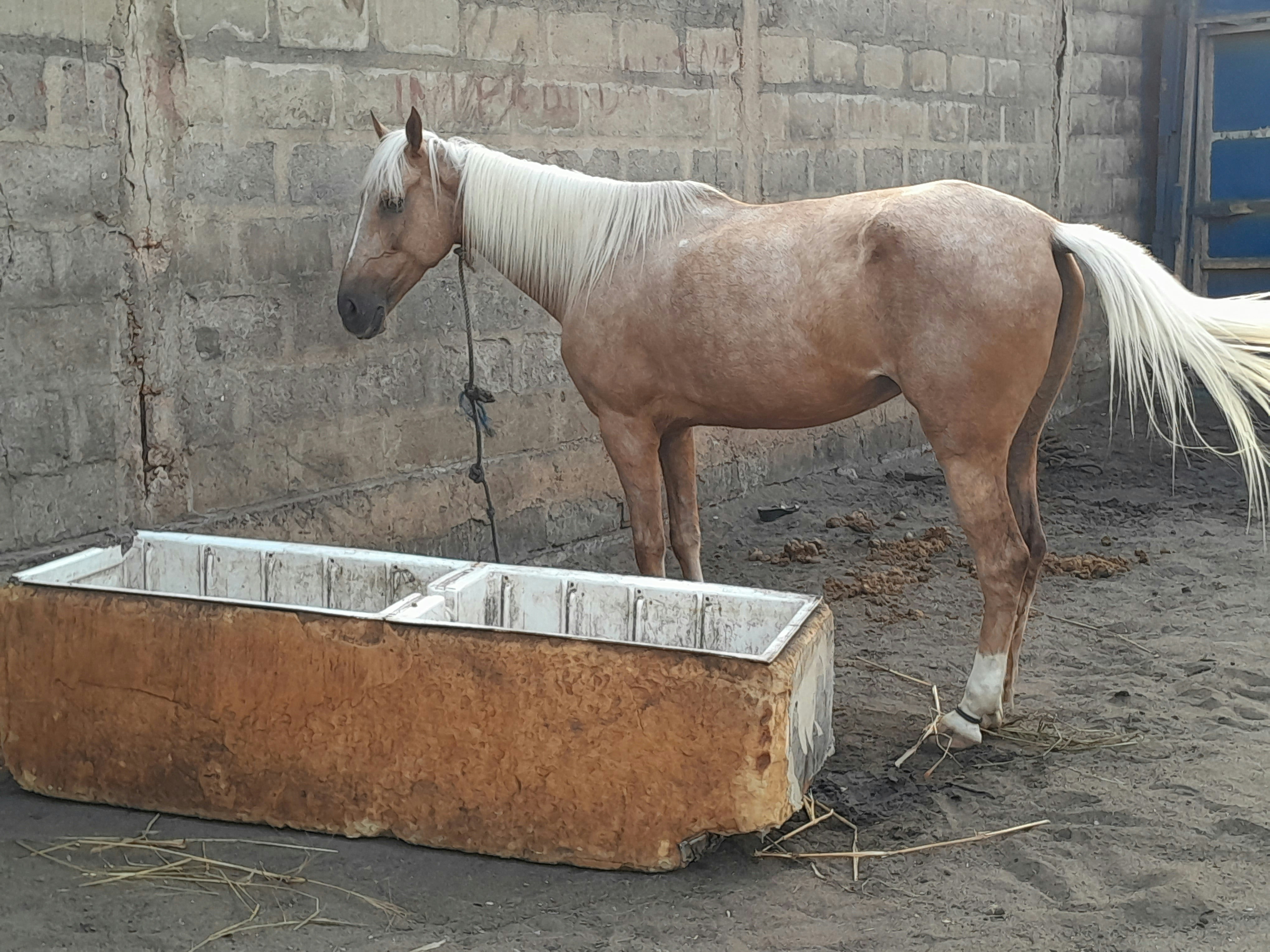 a brown horse standing next to a brick wall