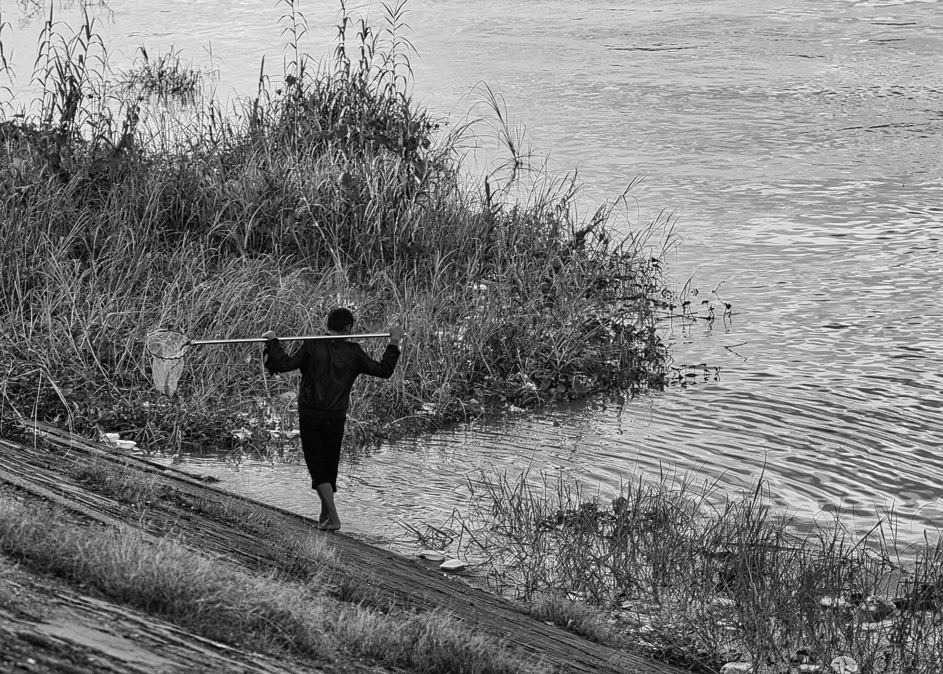 The fisherman with net waiting for prey by Tonle Sap river