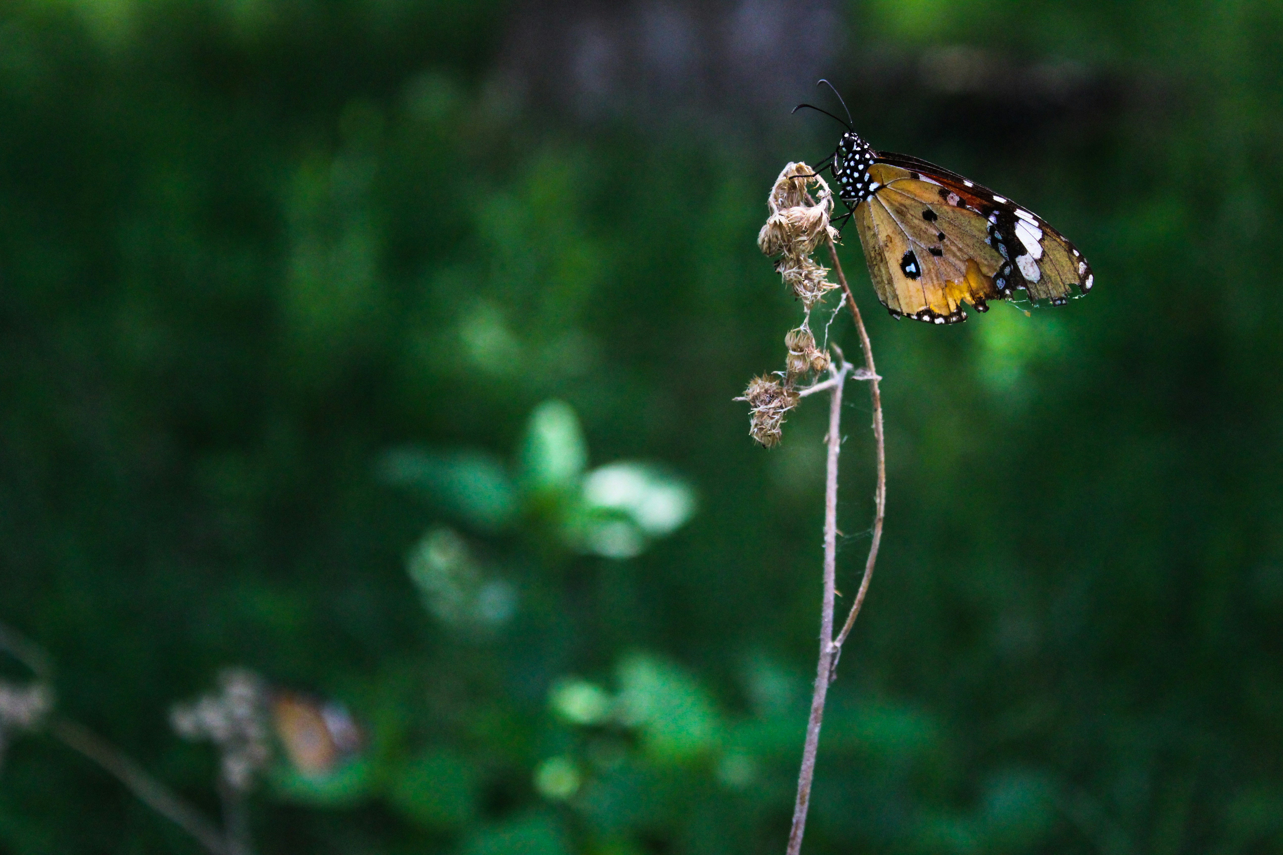 DANAUS CHRYSIPPUS a.k.a "PLAIN TIGER", is a medium-sized butterfly widespread in Asia, Australia and Africa. The body is black with many white spots. The wings are orange, the upperside brighter and richer than the underside. The apical half of the forewing is black with a white band. The hindwing has three black spots in the center. The wings are bordered in black and outlined with semicircular white spots. It mostly feeds on "Milkweed" that contains toxic compounds as a result the plain tiger is unpalatable to most predators.