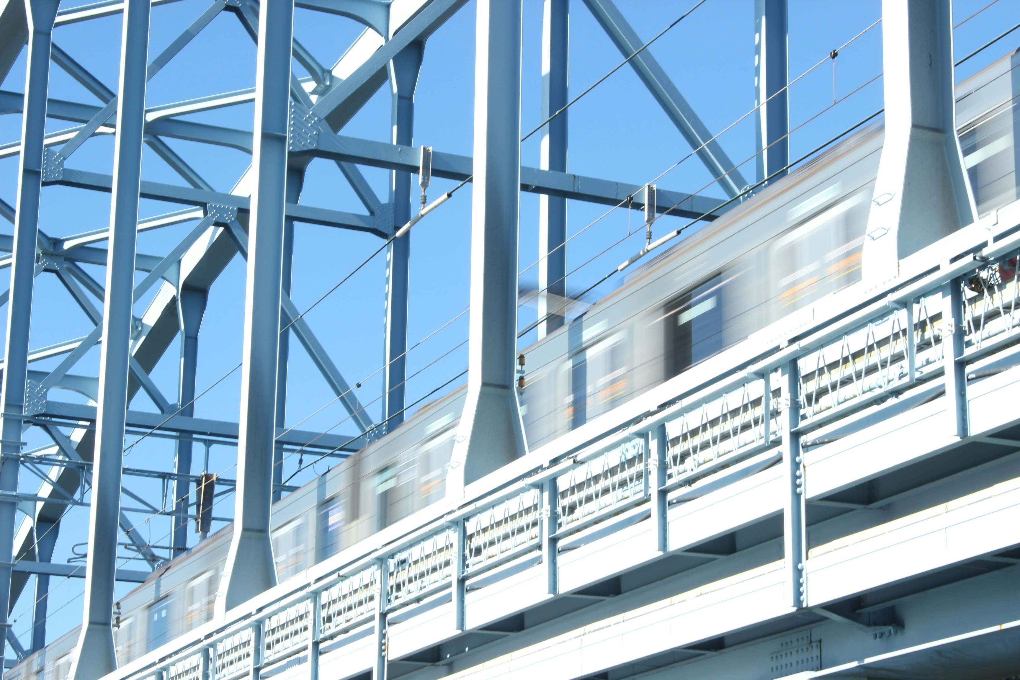 A train going over a bridge on a clear day