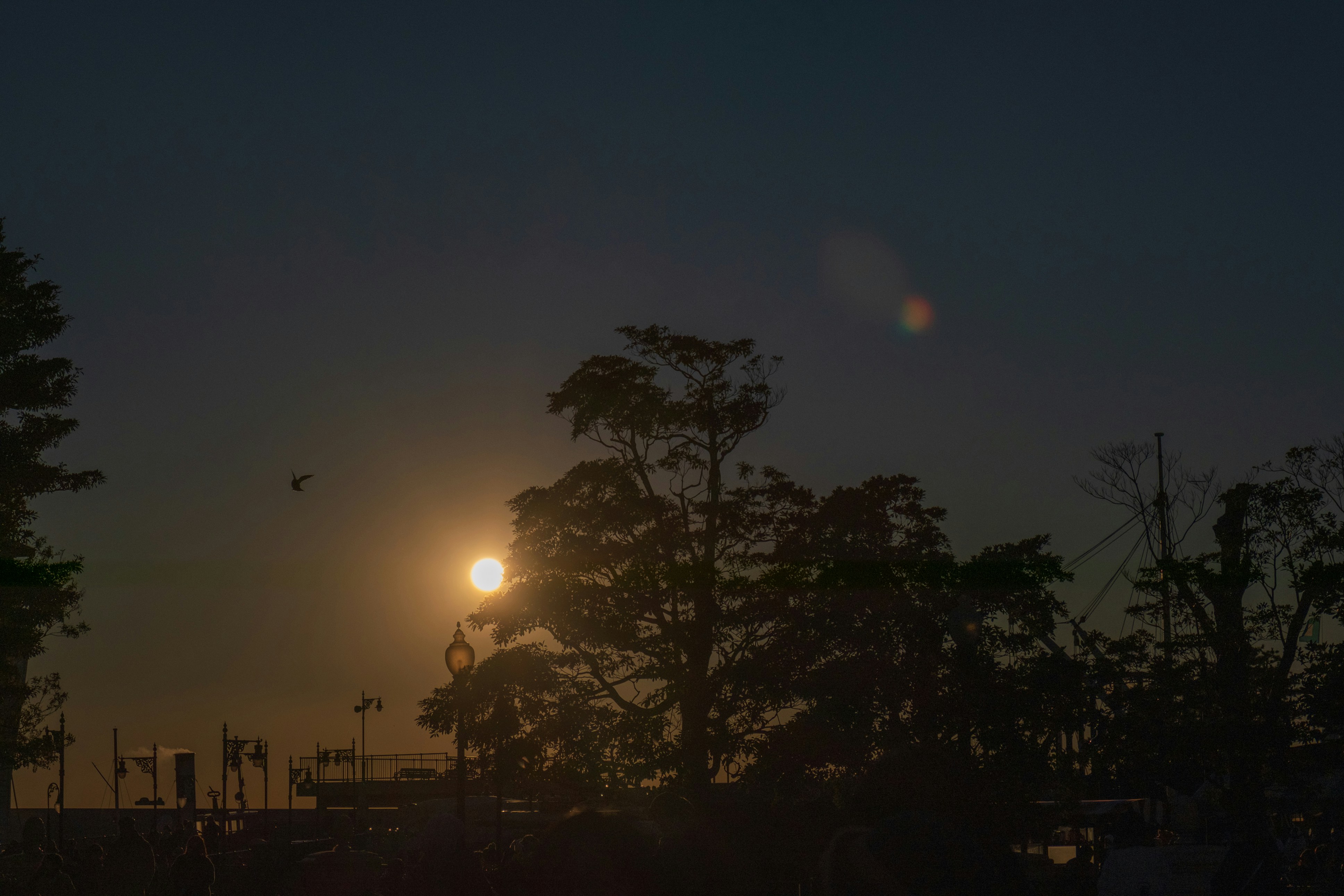The sun is setting over the trees in the distance