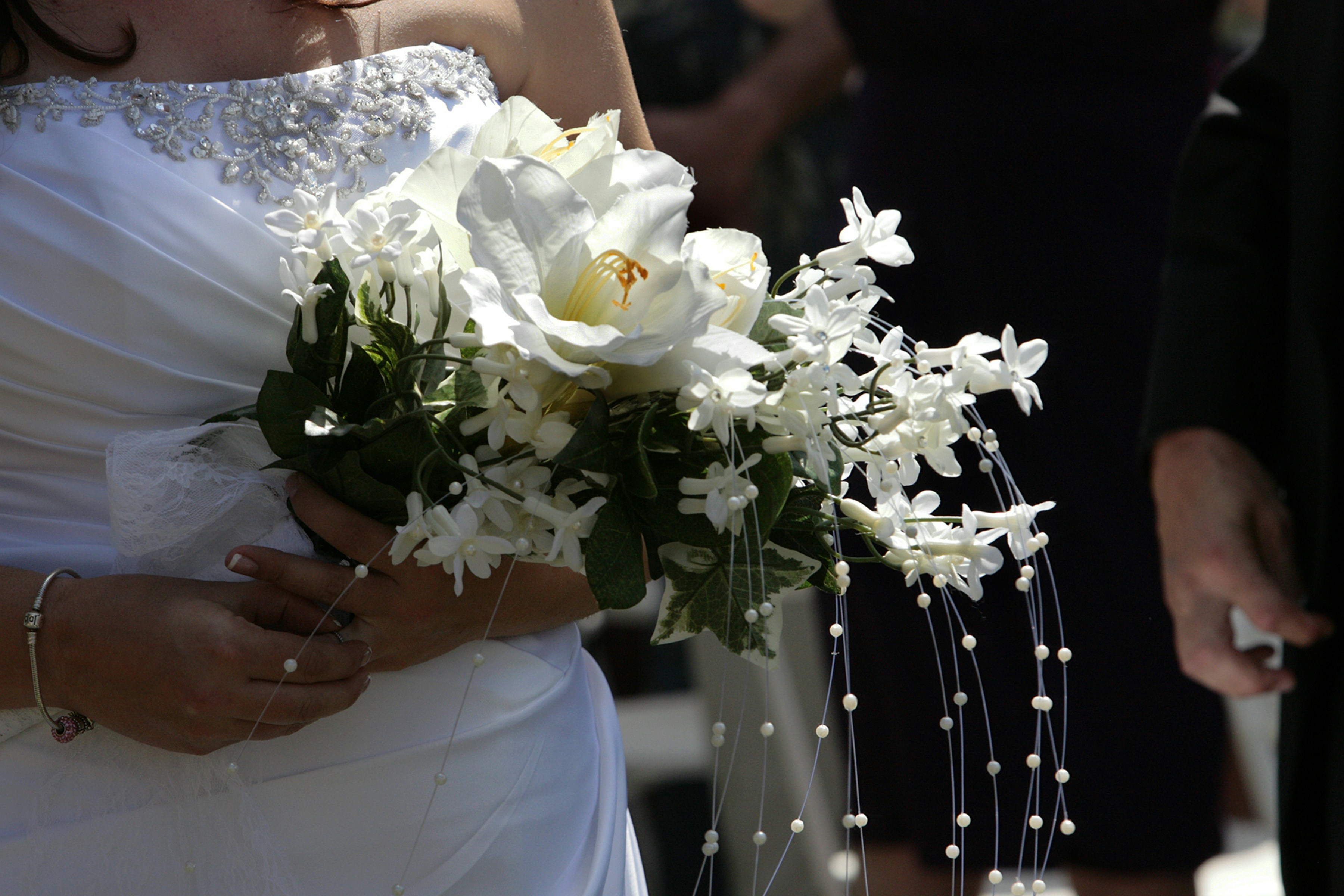 A bride holding a bouquet of white flowers