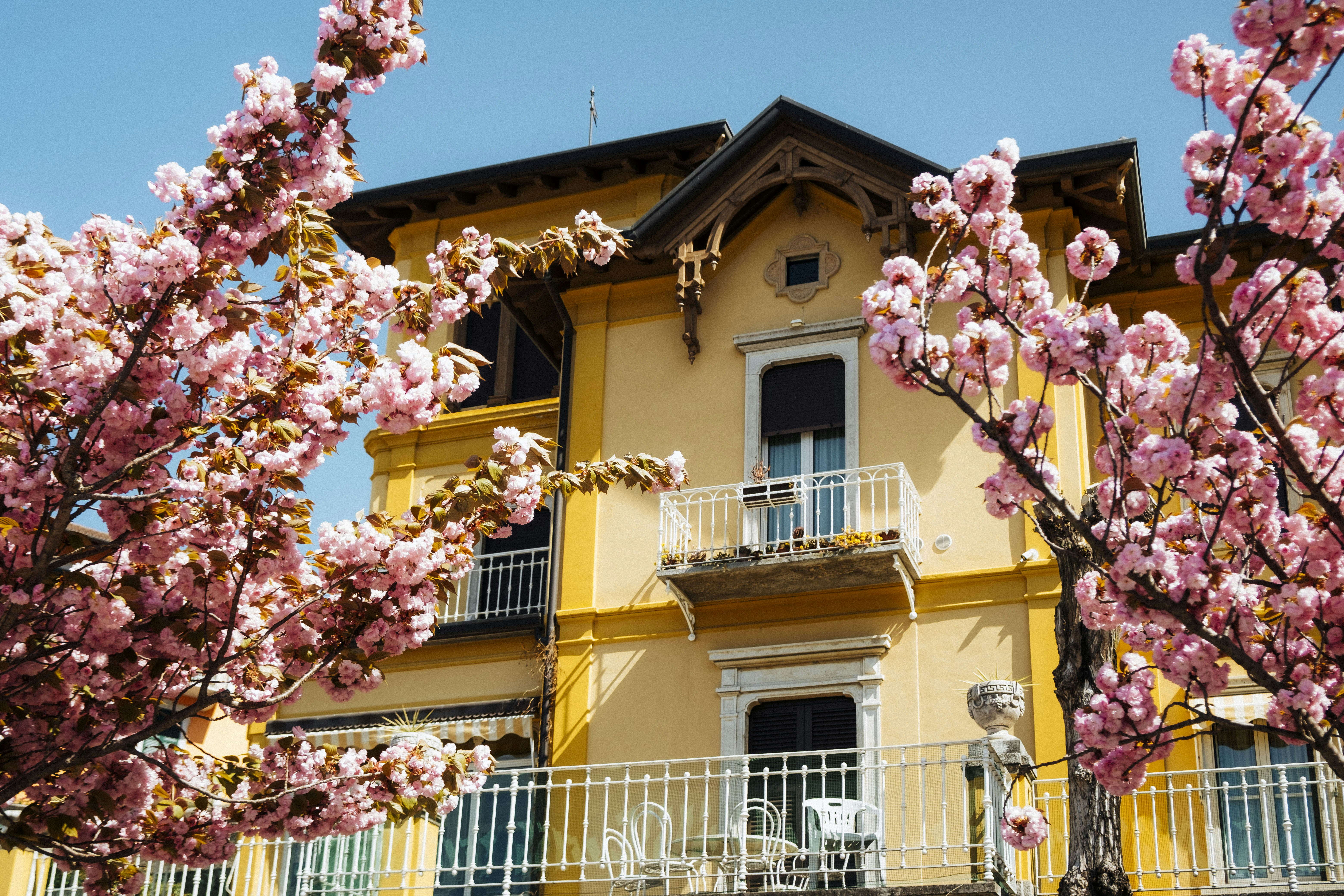 Pink blossoms frame a yellow house beautifully.