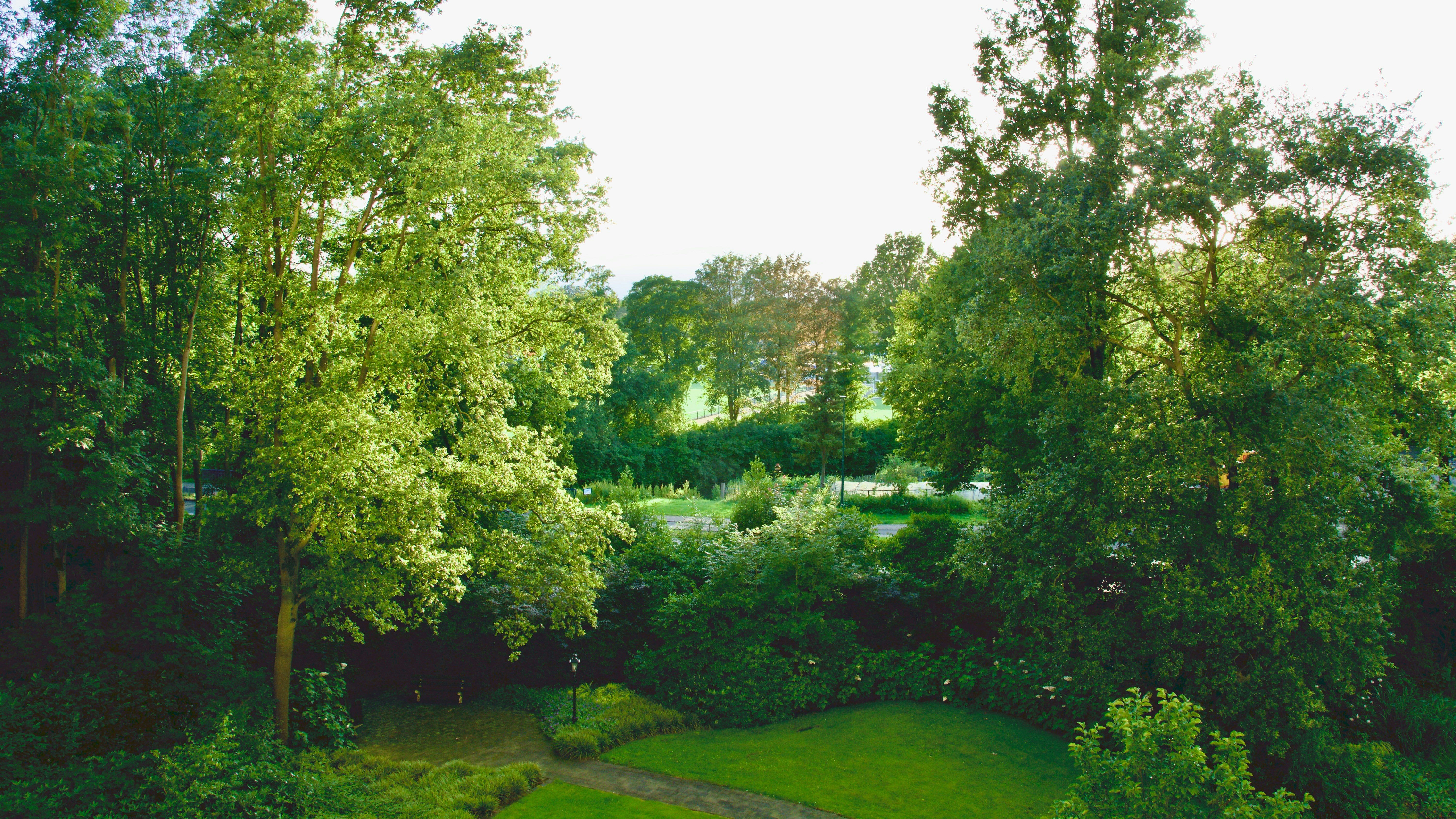 A different perspective of PWA Park in Veenendaal at the beginning of the evening. The setting sun illuminates the scene, casting a warm glow over the apartments, tall trees, and the lush park area. The peaceful evening atmosphere is captured beautifully in this angle.