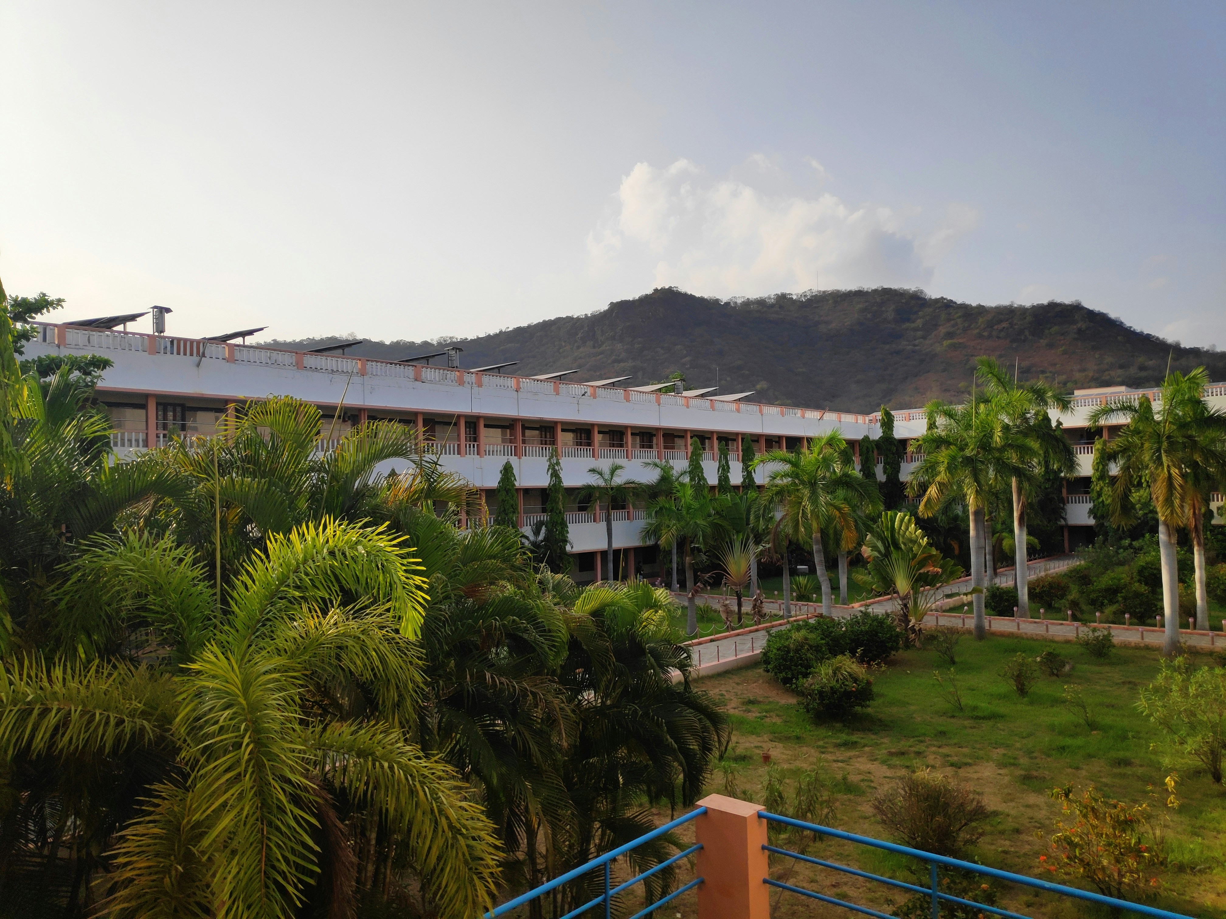 a view of a building with a mountain in the background
