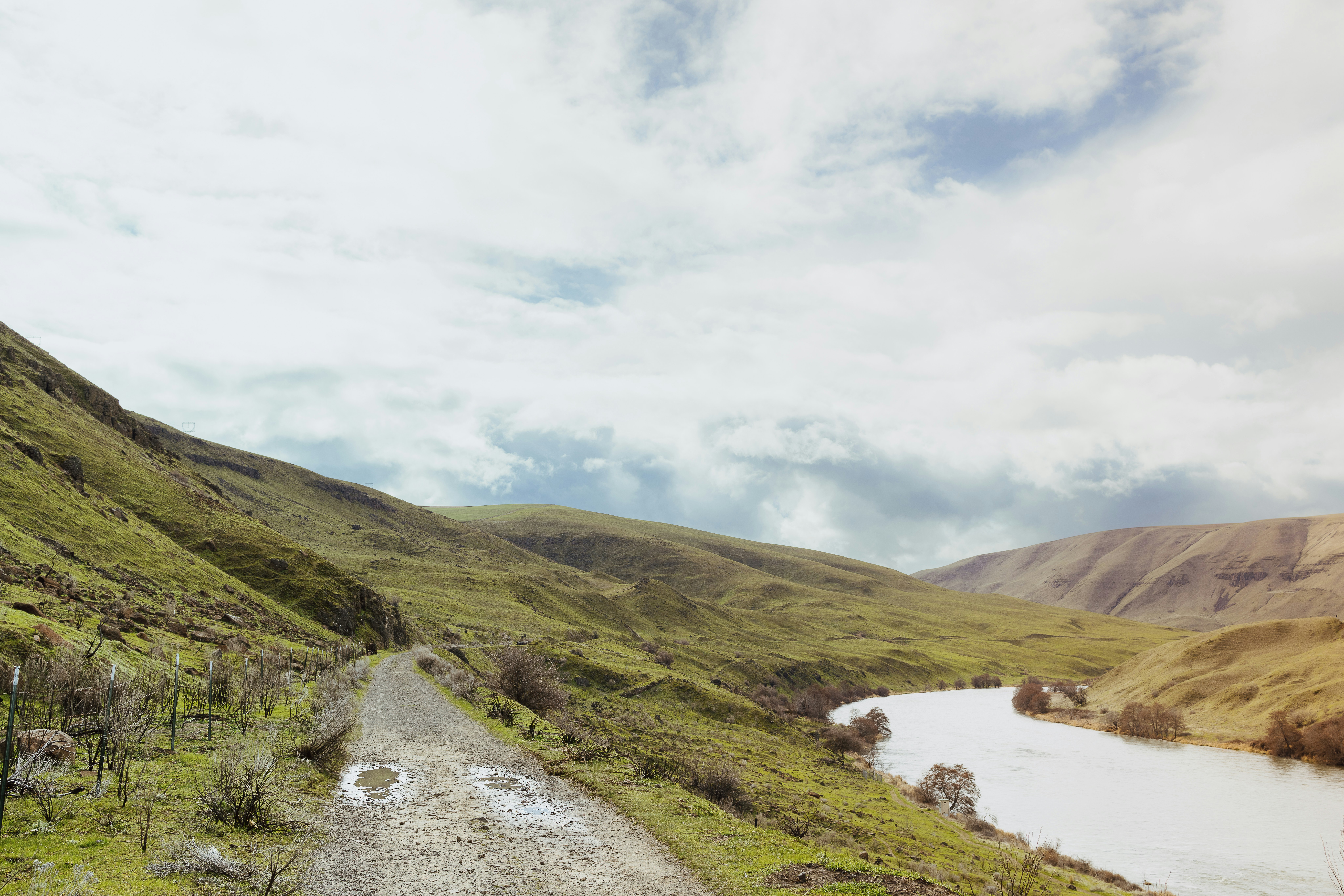 A man riding a bike down a dirt road next to a river