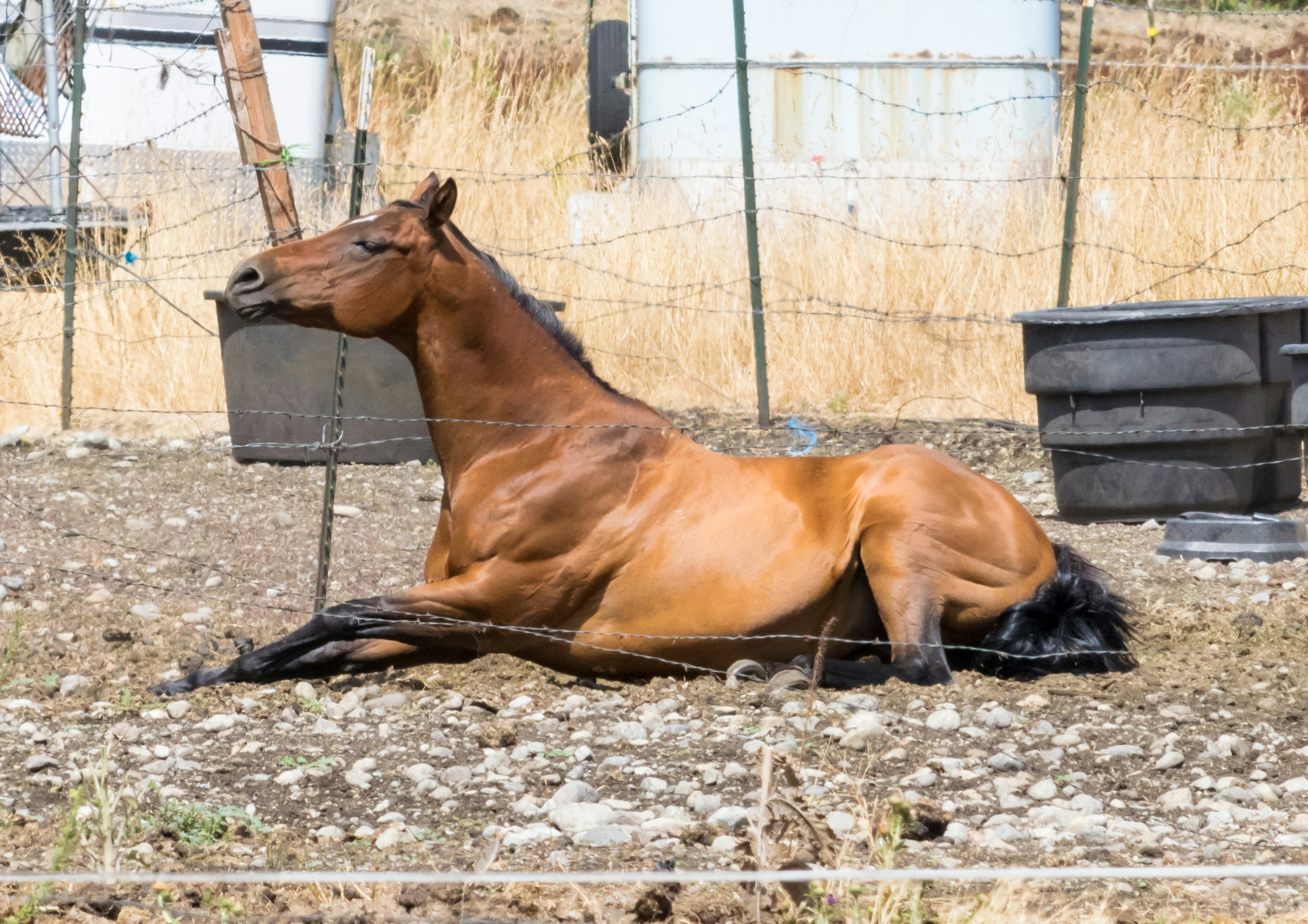 A brown horse laying on top of a dirt field