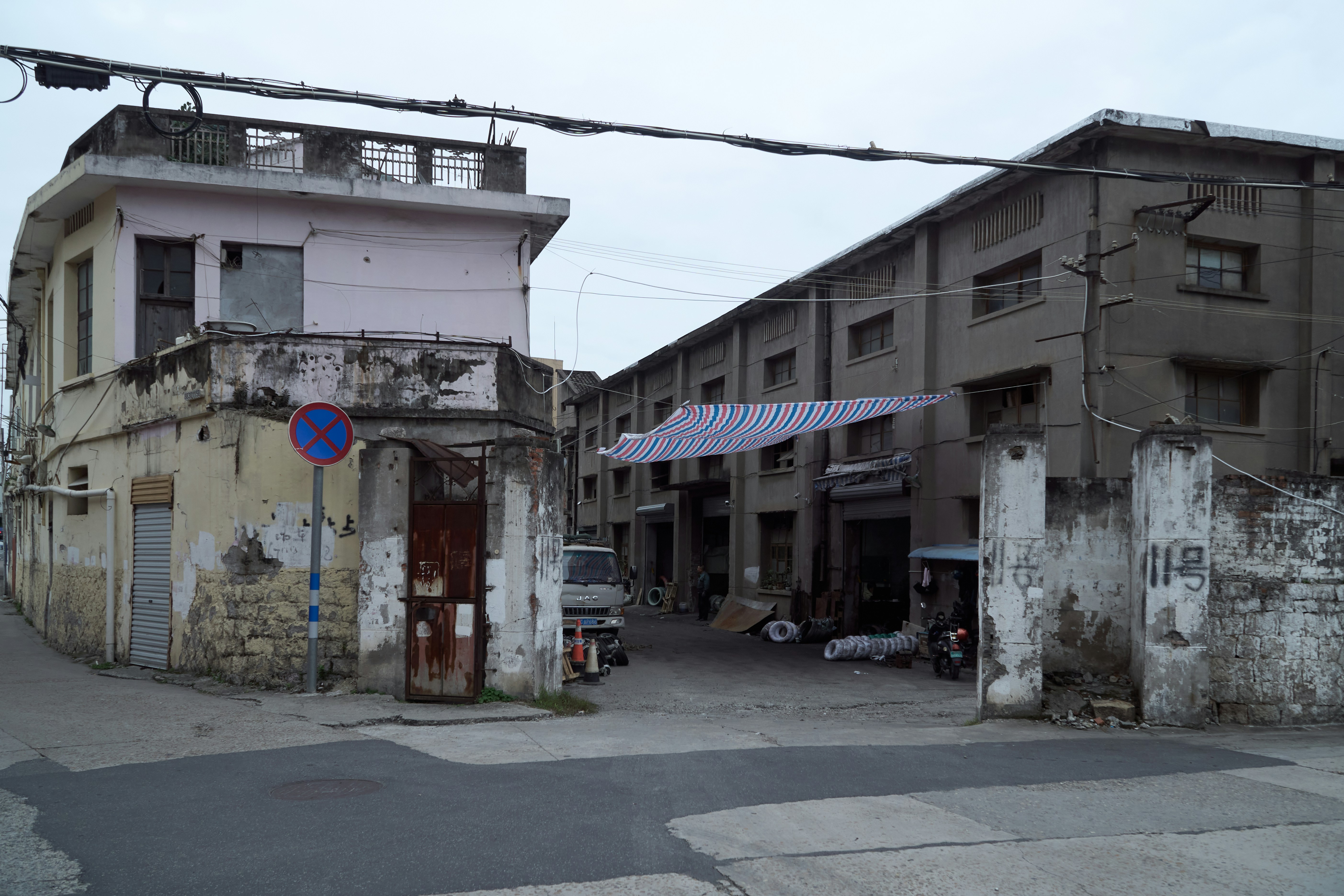 An old building with a blue sign in front of it
