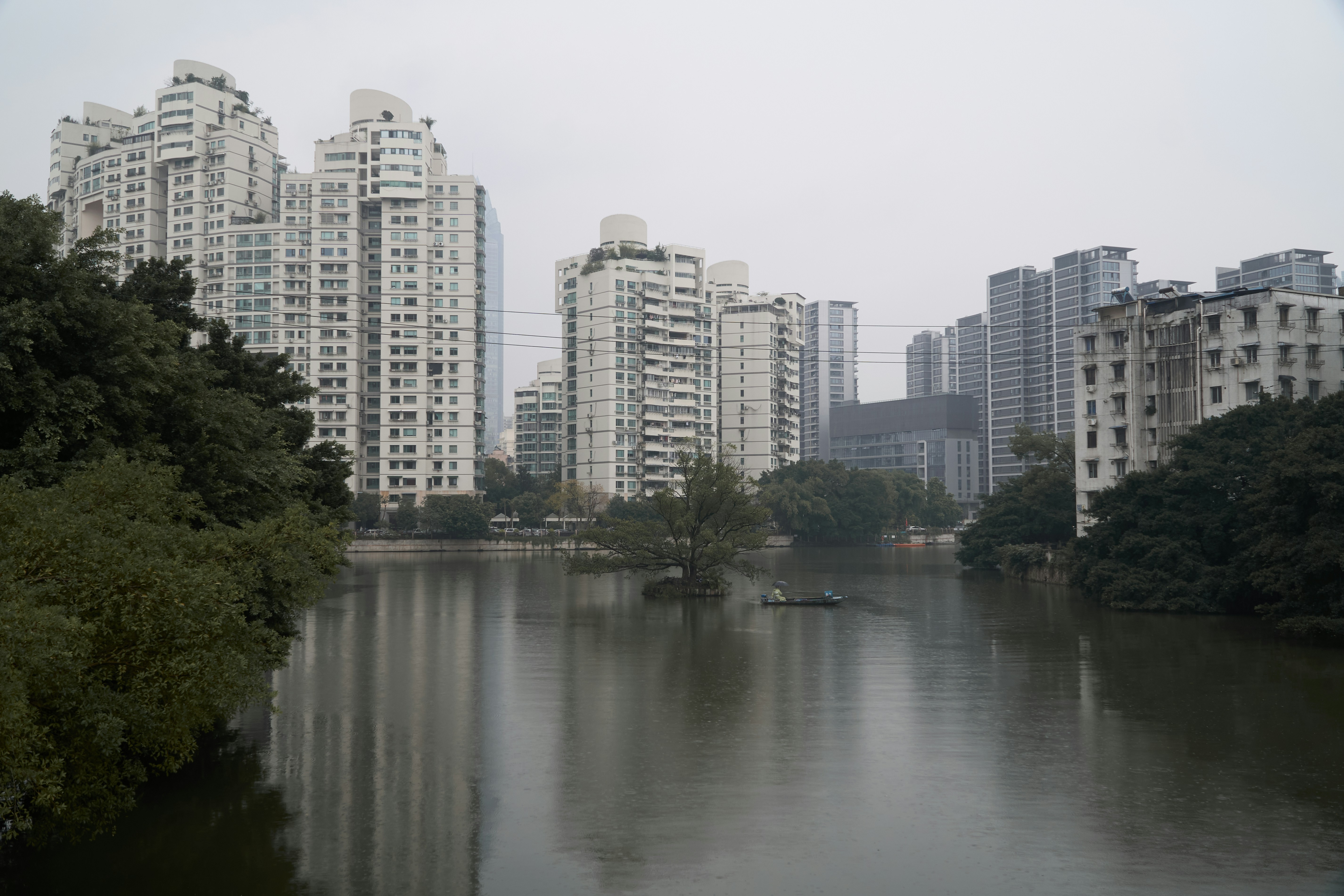 A body of water surrounded by tall buildings