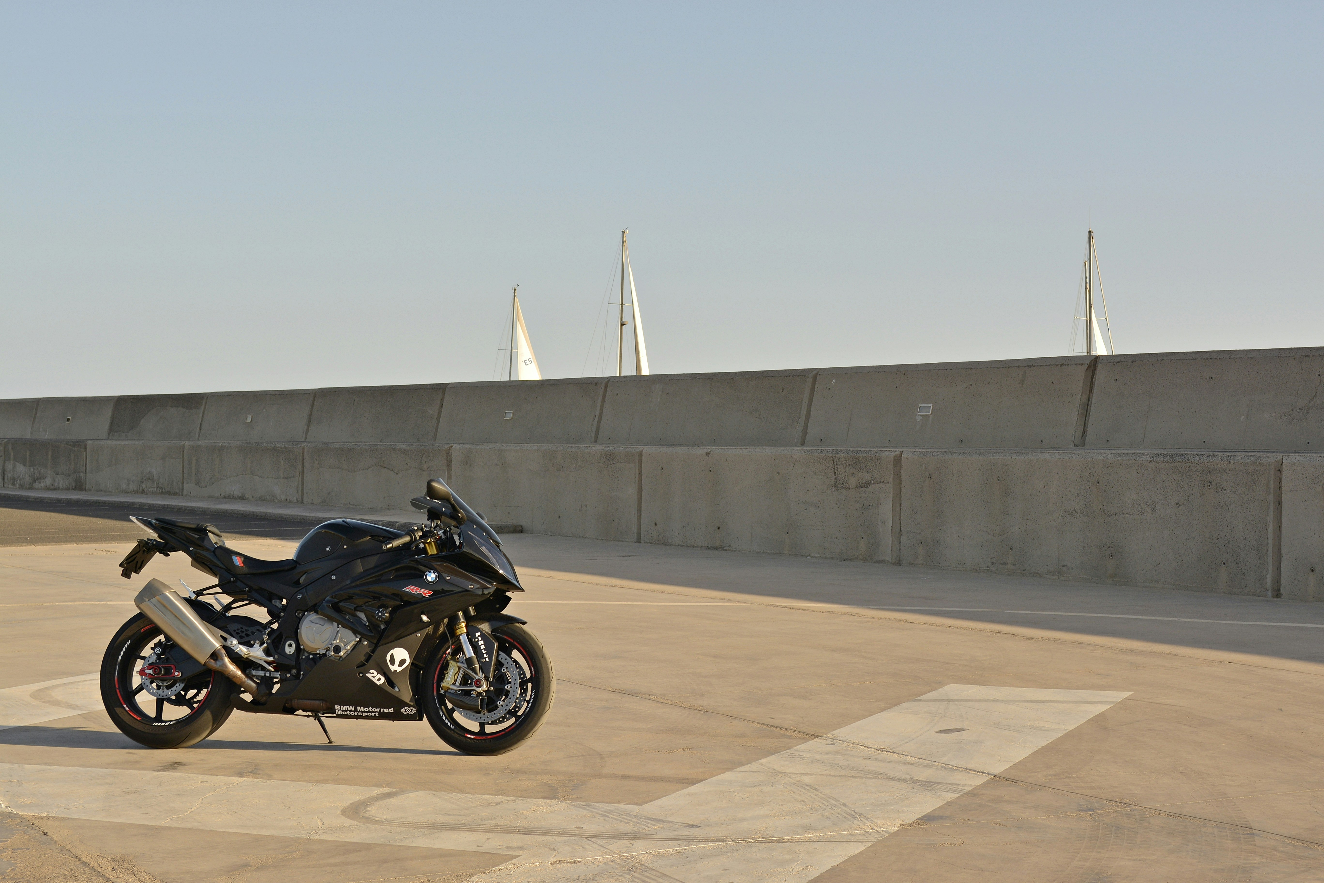 black motorcycle parked on brown concrete floor