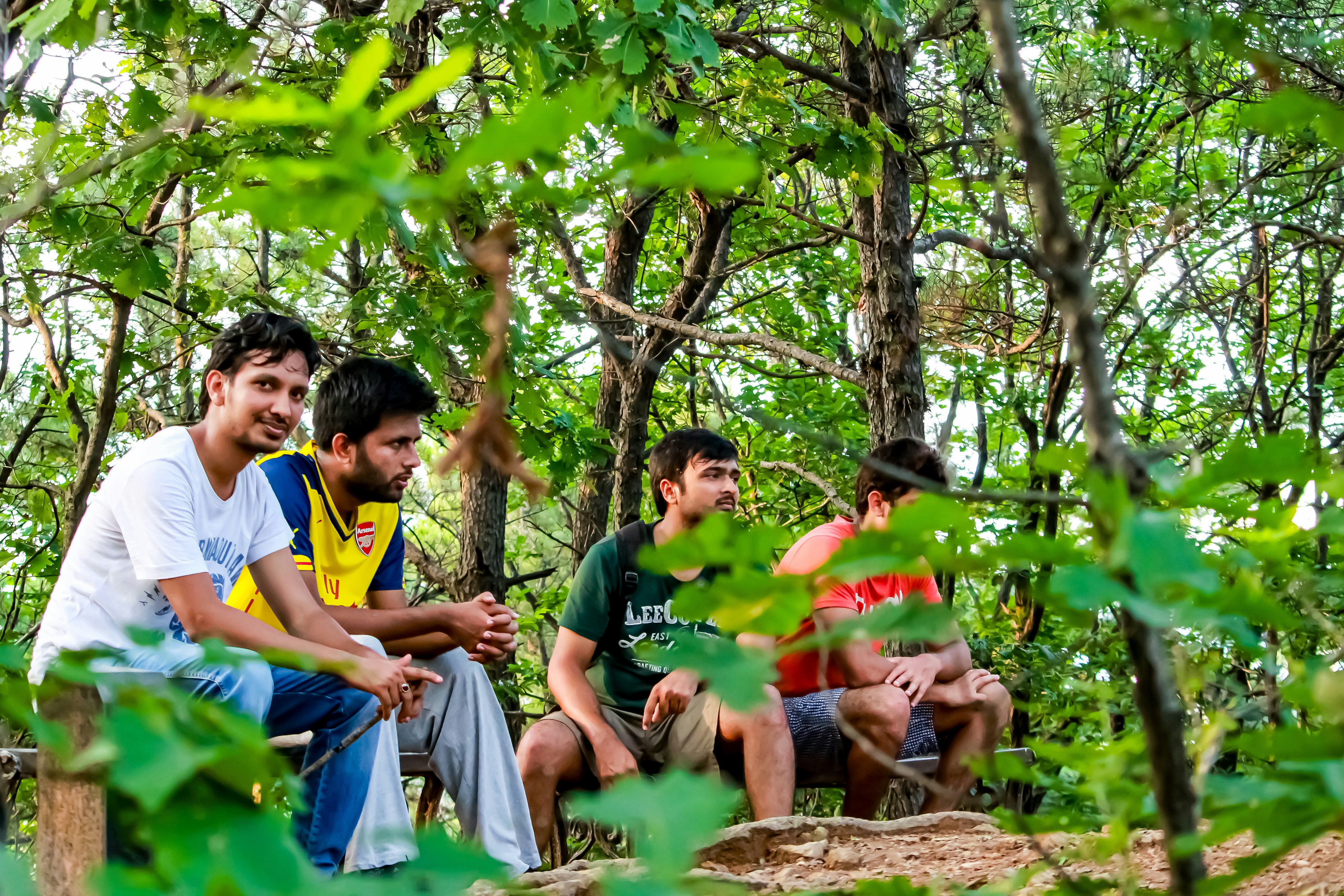 A group of people sitting on a bench in the woods