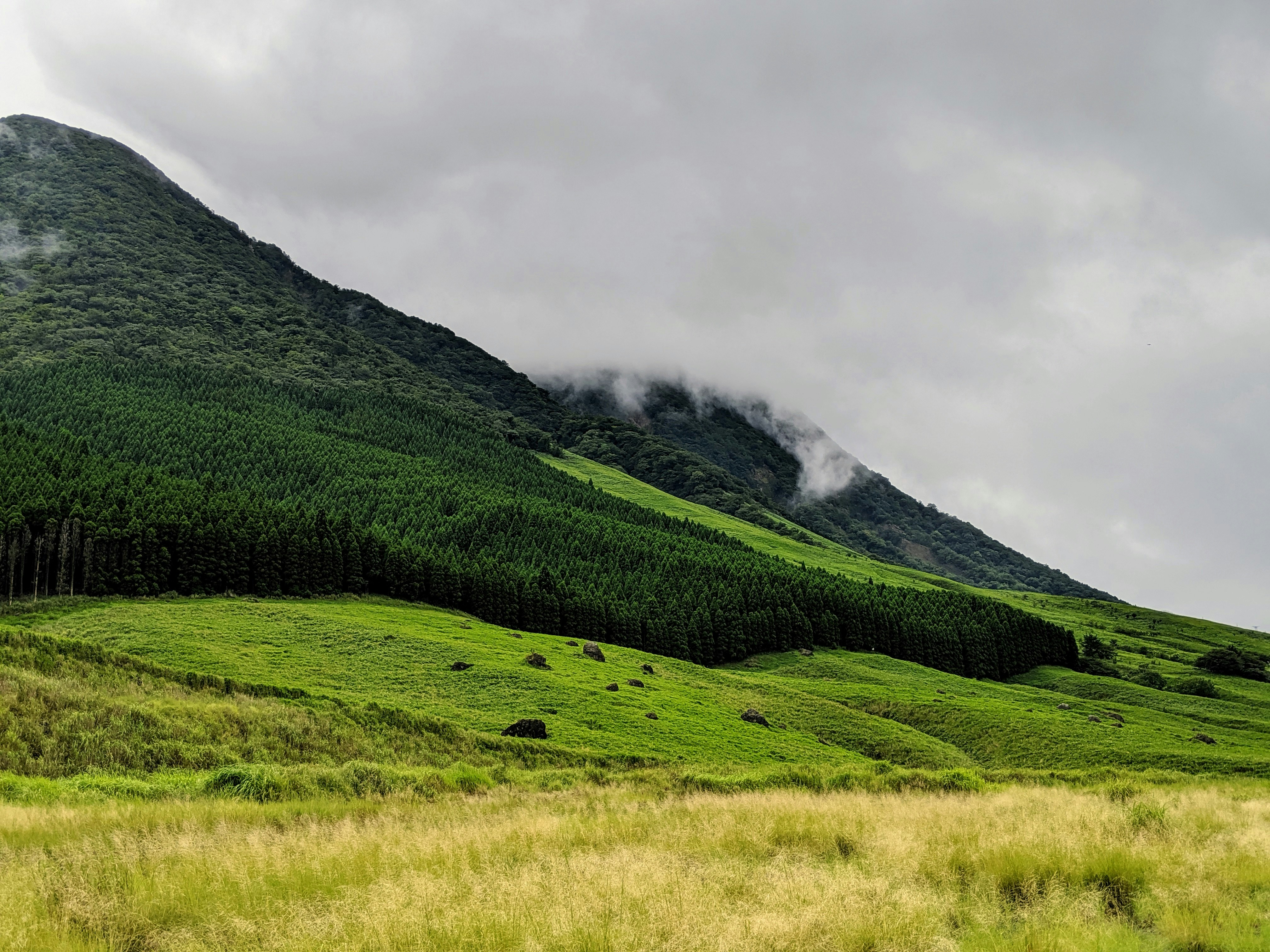 green grass field near mountain under white clouds during daytime