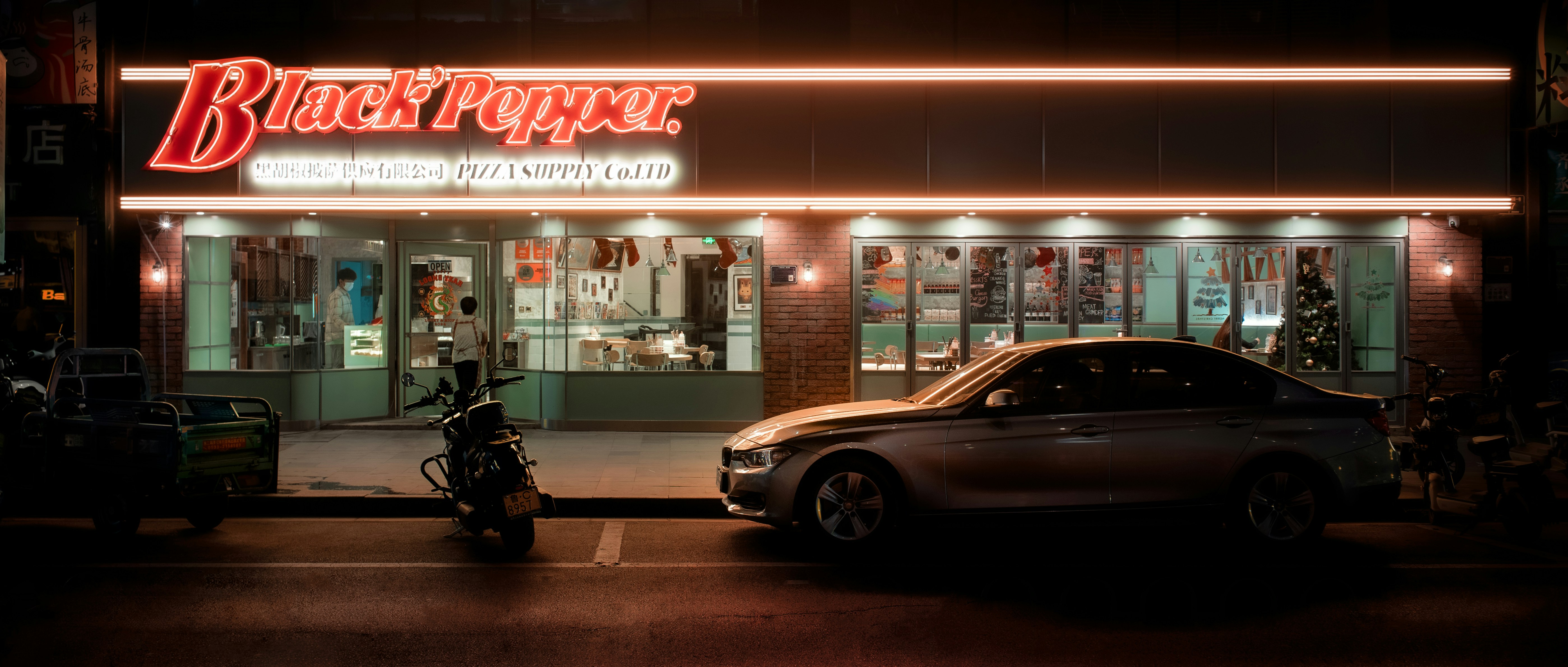 Night scene in front of a restaurant named Black Pepper Co., ltd.